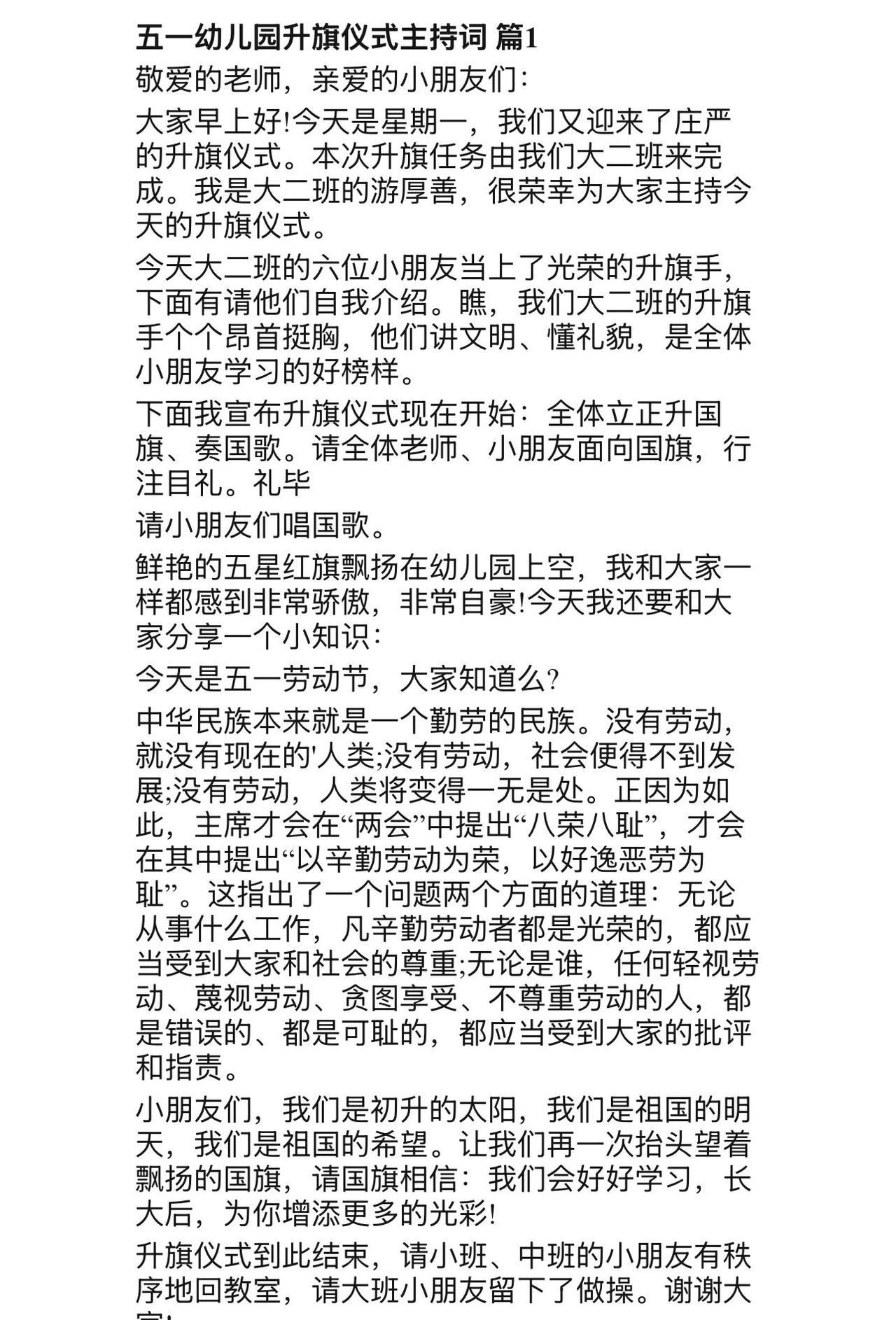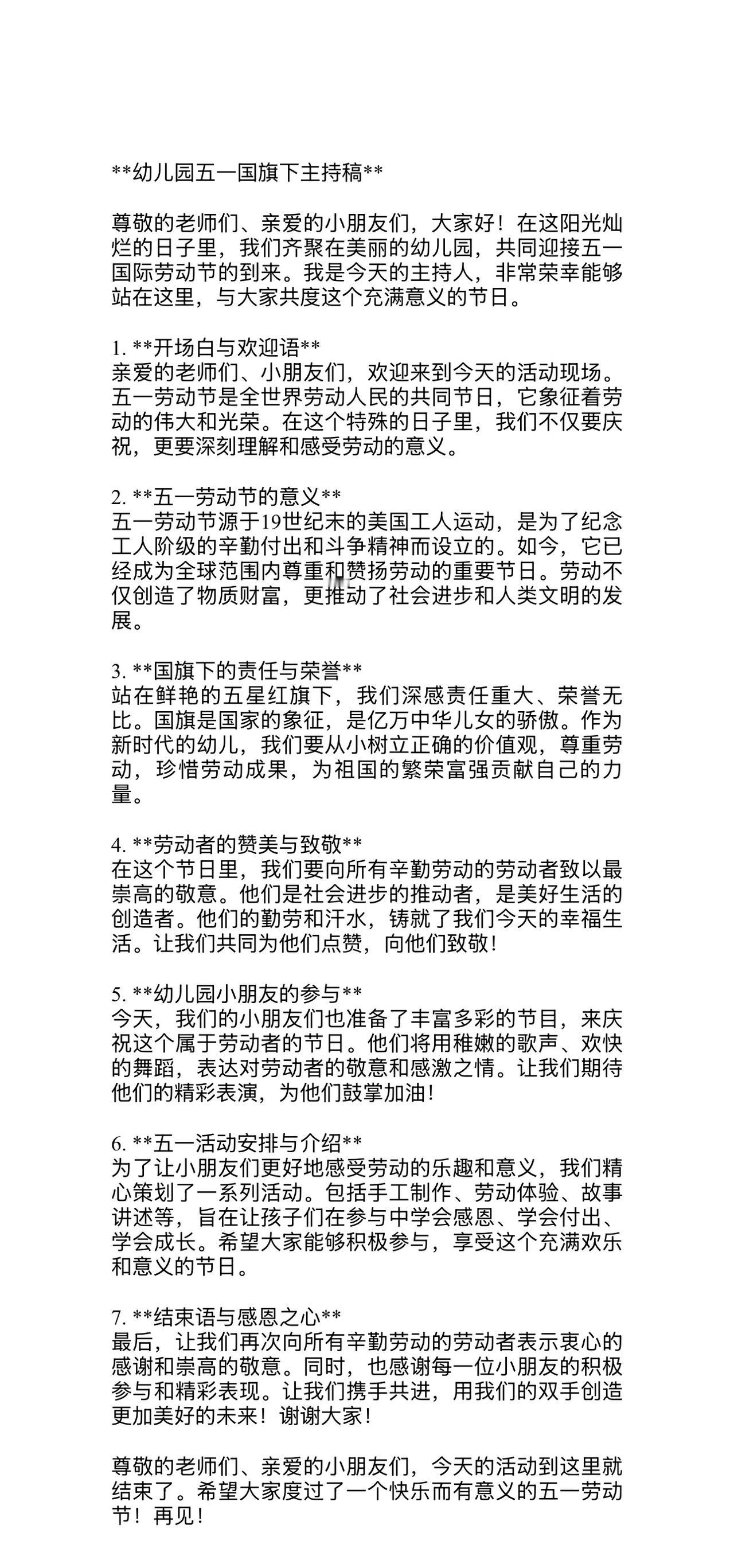尊敬的老师们、亲爱的小朋友们,大家好!在这阳光灿烂的日子里,我们齐聚在美丽的幼儿园,共同迎接五一国际劳动节的到来。我是今天的主持人,非常荣幸能够站在这里,与大家共度这个充满意义的节日。