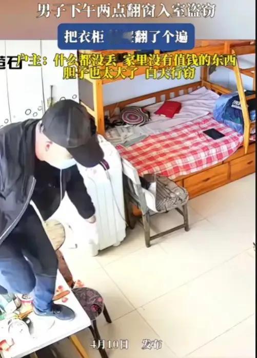 小偷看起来人高马大,有可能就是四肢发达、头脑简单、好吃懒做之辈。看他戴着帽子、口罩和手套,应该是惯犯,只不过这次运气不好,钱没找到,还被全程拍了下来。