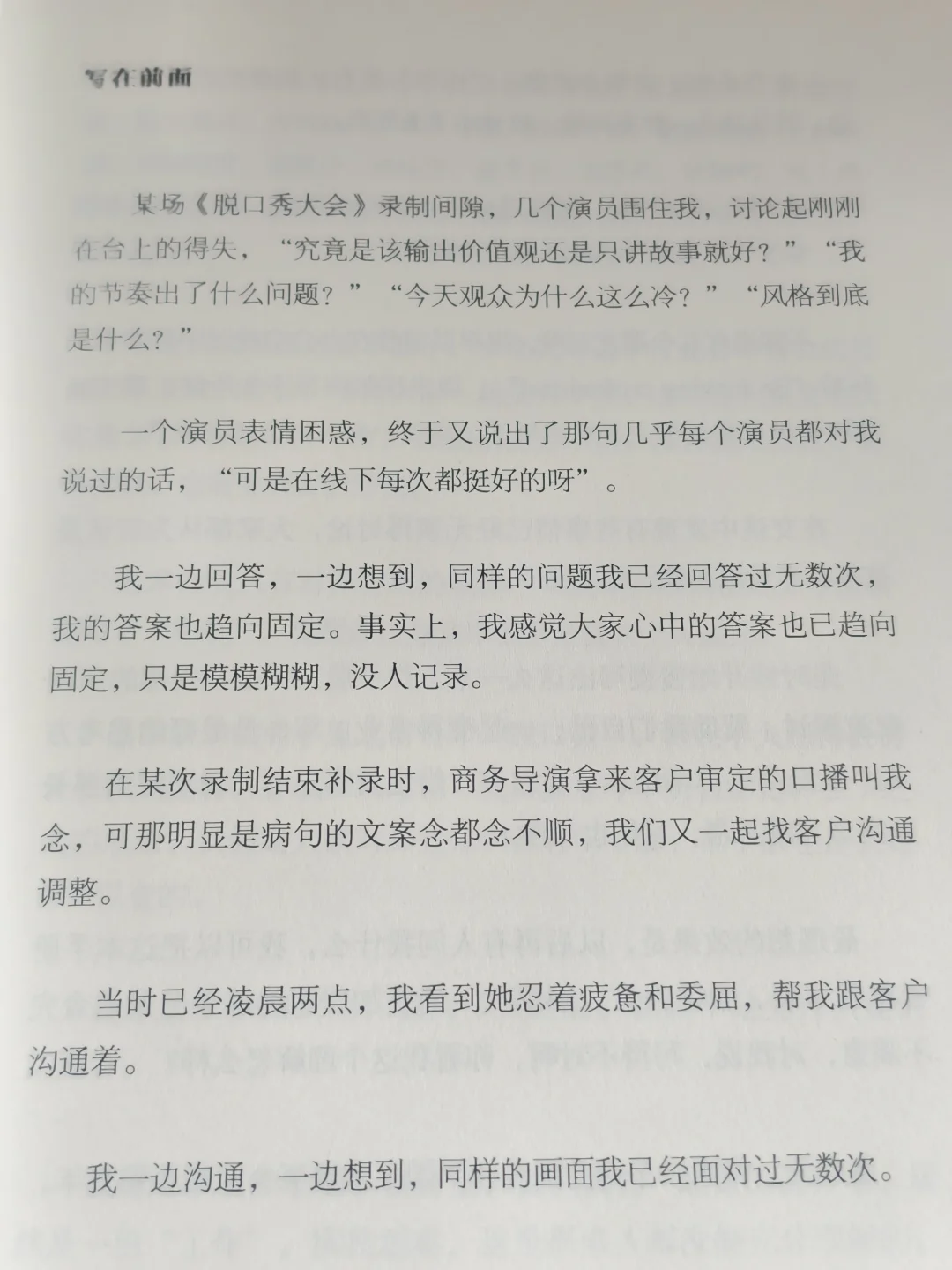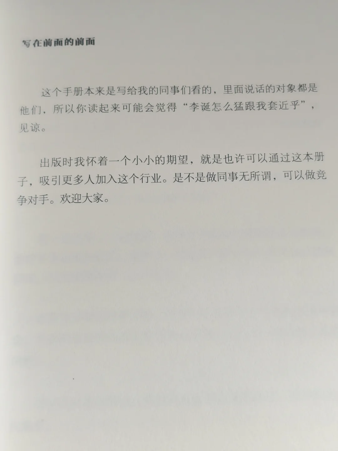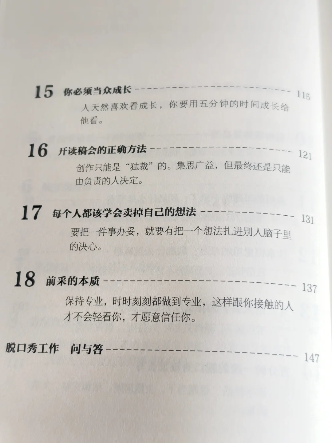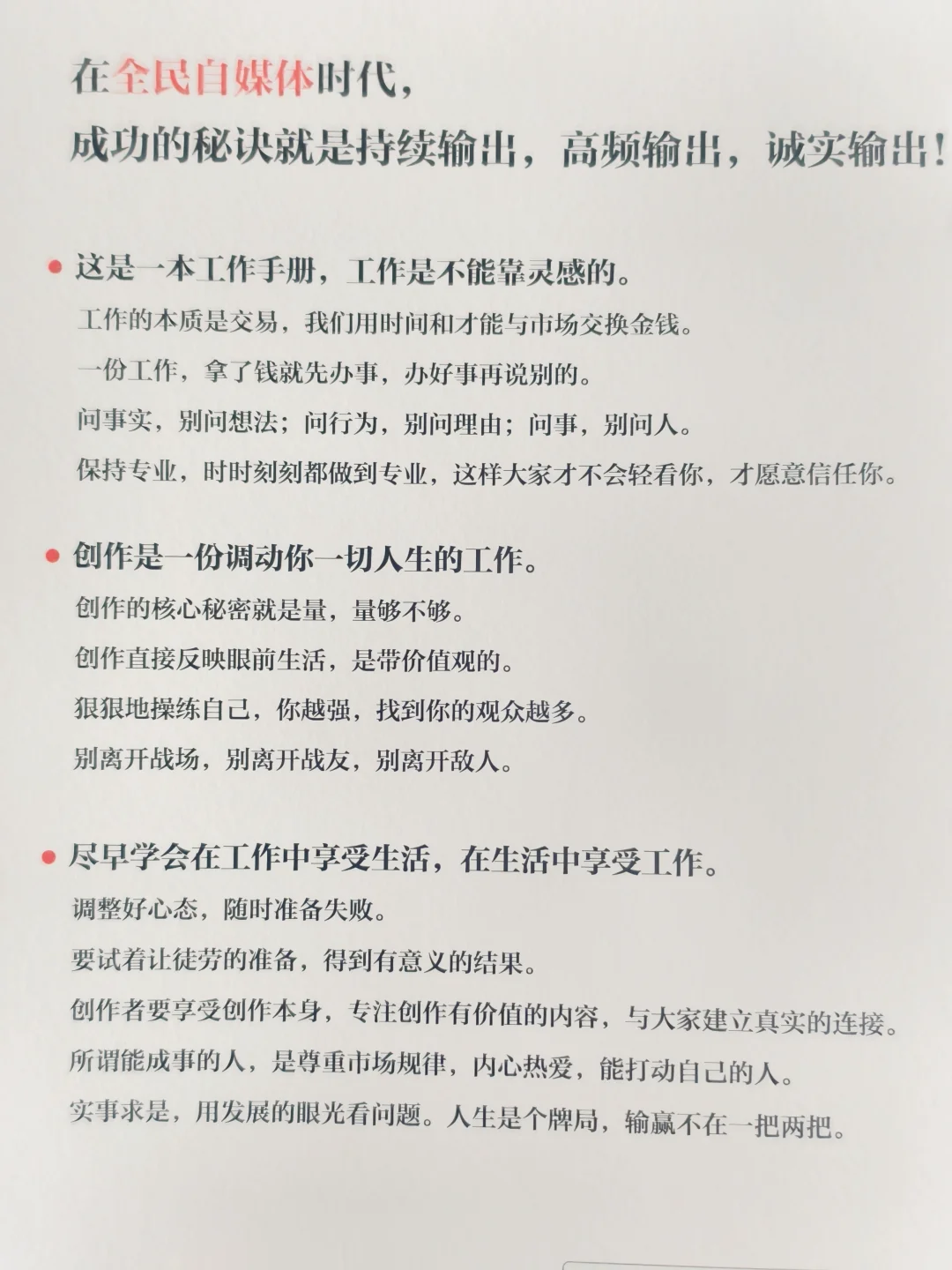 他坚持写逐字稿,是因为语言有肌肉记忆,写下来的过程就是梳理逻辑、精简废话、寻找节奏的过程。台上的松弛感,是无数次练习换来的!他说:创意是智力活儿,也是体力活儿,归根结底是苦力活儿。读完最大的感悟就是:持续输出、高频输出、诚实输出,才是在自媒体时代成功的真正秘诀!