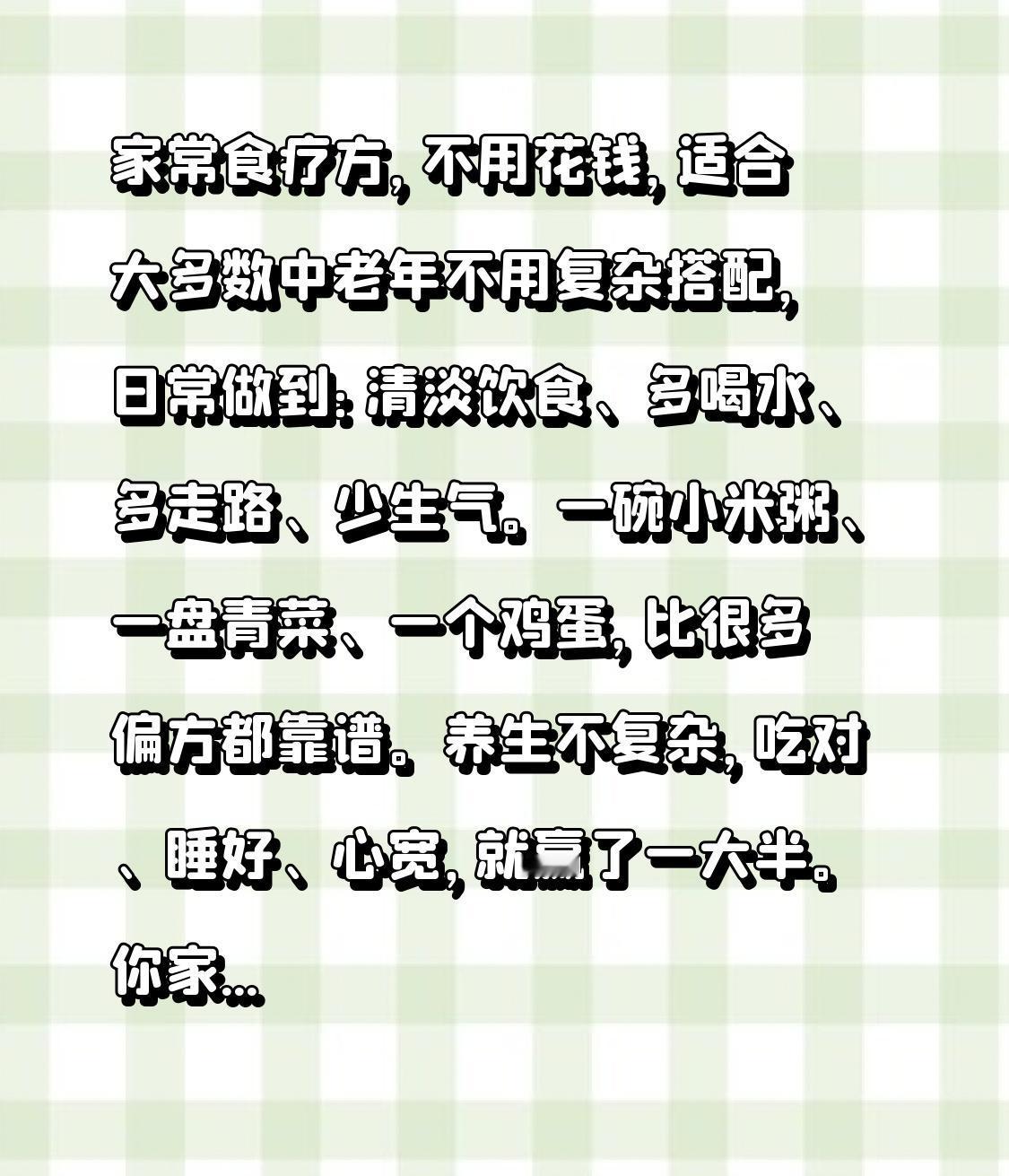 家常食疗方,不用花钱,适合大多数中老年 不用复杂搭配,日常做到: 清淡饮食、多喝水、多走路、少生气。 一碗小米粥、一盘青菜、一个鸡蛋, 比很多偏方都靠谱。 养生不复杂,吃对、睡好、心宽,就赢了一大半。 你家平时最常吃的养生食物是什么?