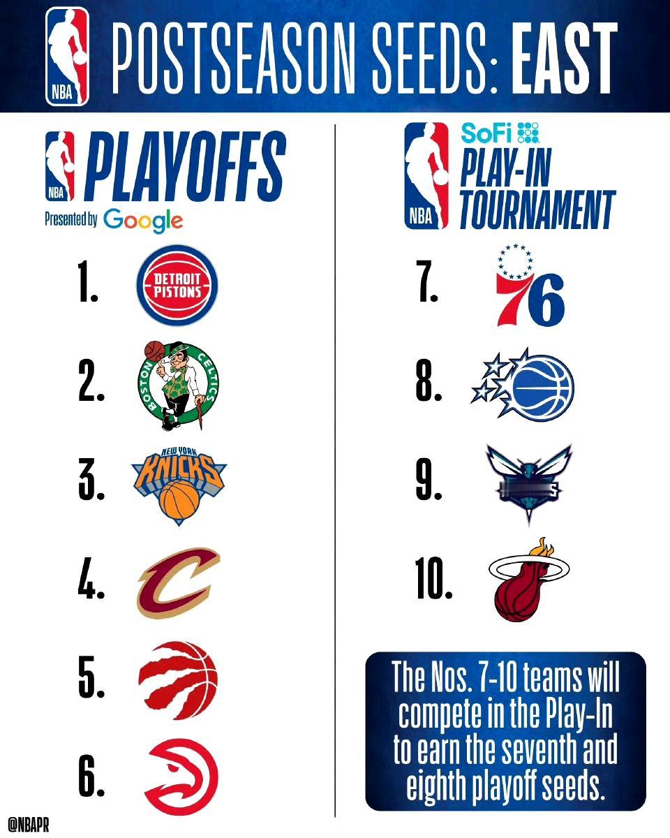 东部:猛龙、老鹰最终抢到两个季后赛名额。76人去打附加赛,魔术第八,黄蜂第九。