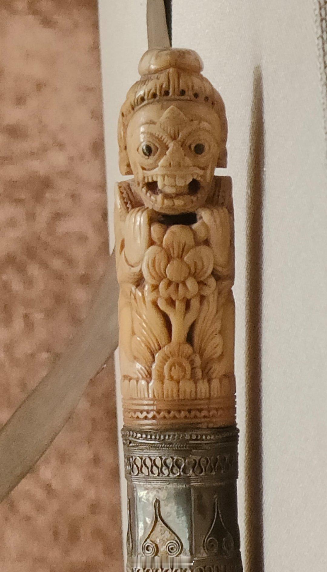 这把刀柄的雕刻还是非常细致,刀柄以象牙精雕,立体镂空佛像(“骨神”) ,有介绍说这是融合南传佛教信仰与傣族“神象护持”创世神话 。