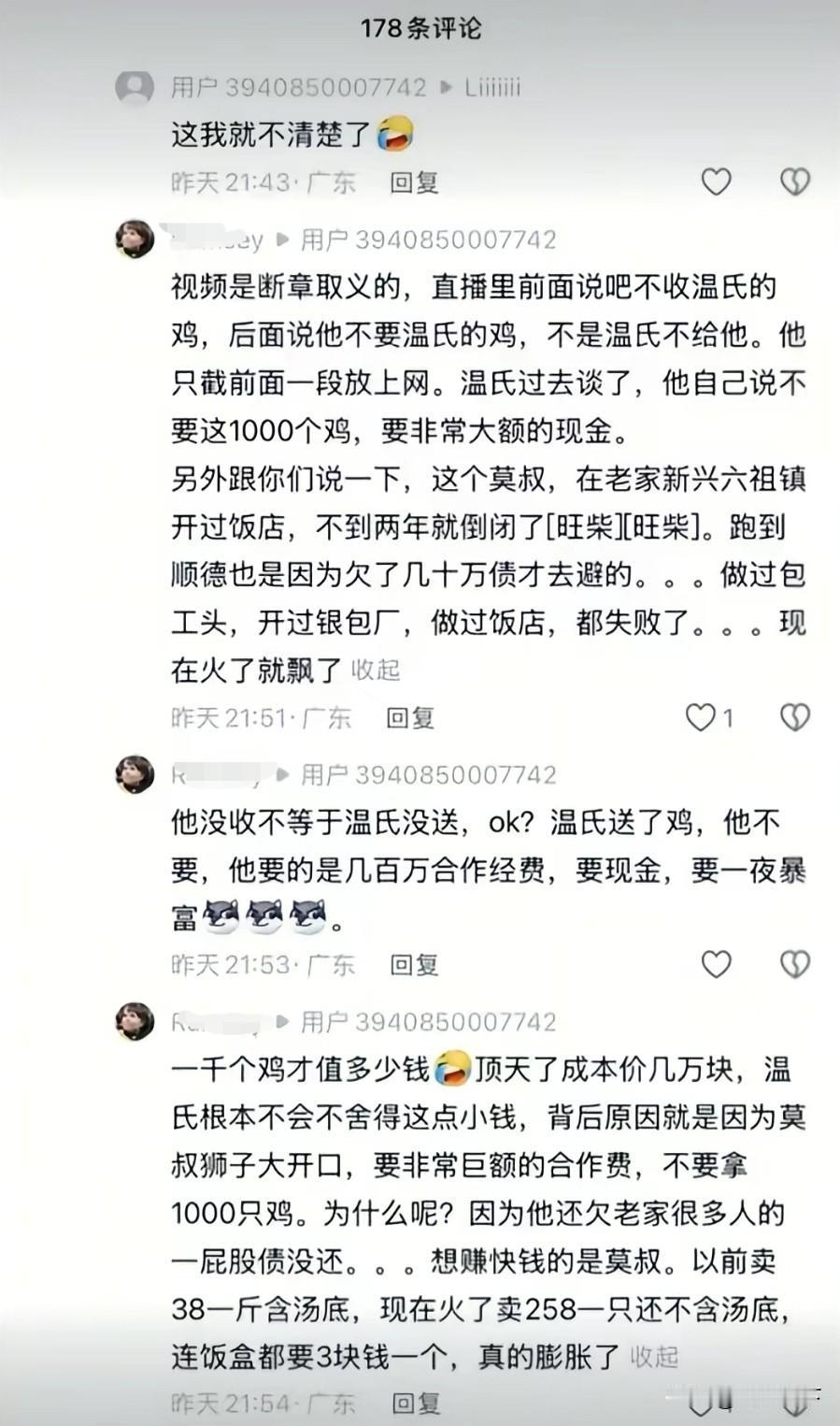 果然是人红是非多啊,莫氏鸡煲刚红,这老莫的各种黑料就来了,老莫在直播中说没有收到温氏送的1000只鸡,然后就有网友评论说老莫不要鸡是想要几百万的合作经费,还说老莫去顺德是为了躲债,这真是上下嘴唇一碰什么话都敢说啊。