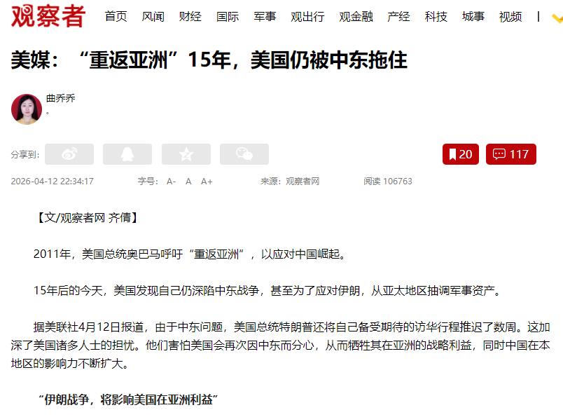 美媒吐槽:美国花15年搞“重返亚洲”,到最后啥也没捞着,反倒被中东的烂摊子缠得走不开,连特朗普的访华行程都被耽误了。
