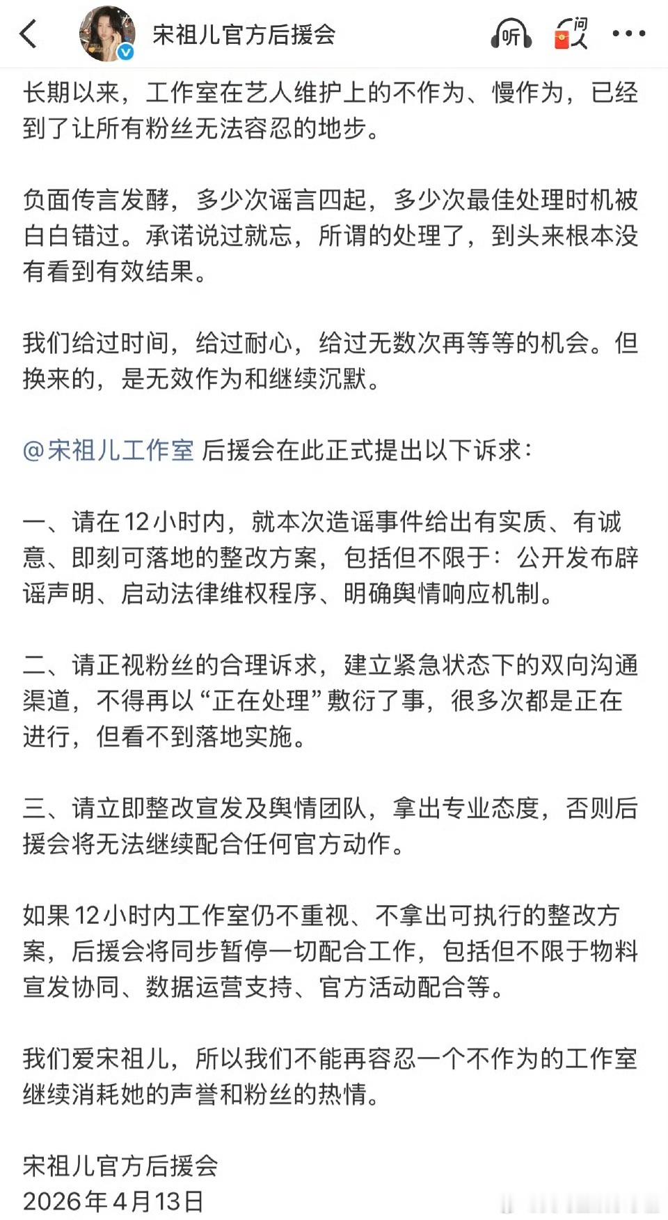 宋祖儿粉丝开始维权,要求工作室回应之前疑似宋祖儿小号被扒一事,你怎么看?宋祖儿工作室 慢作为