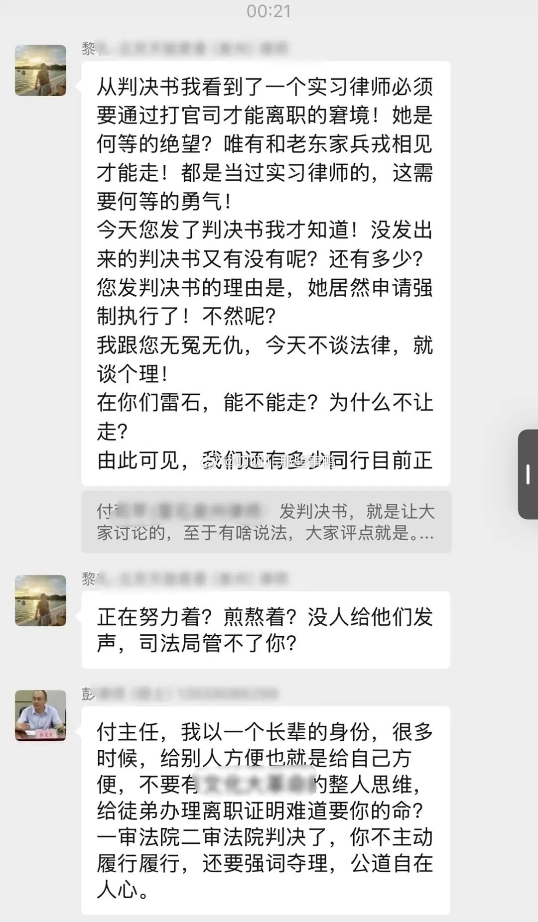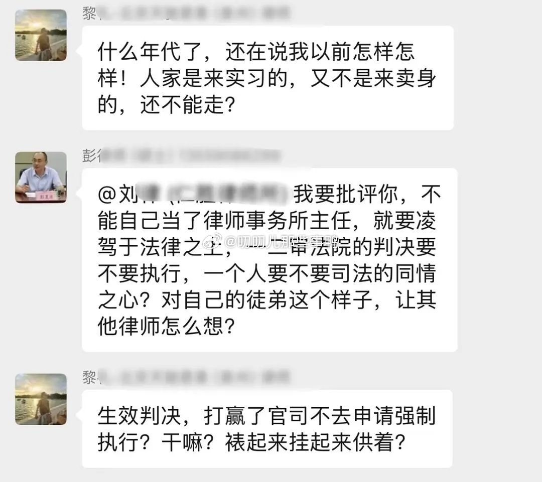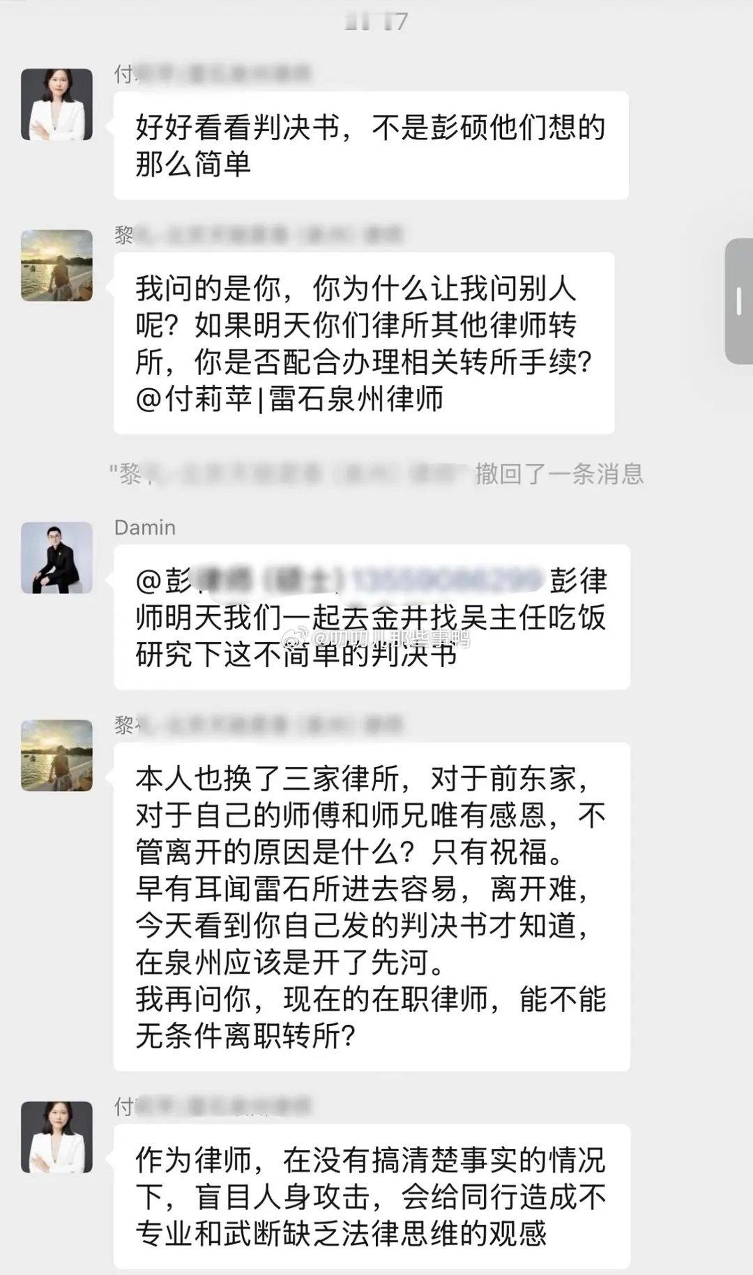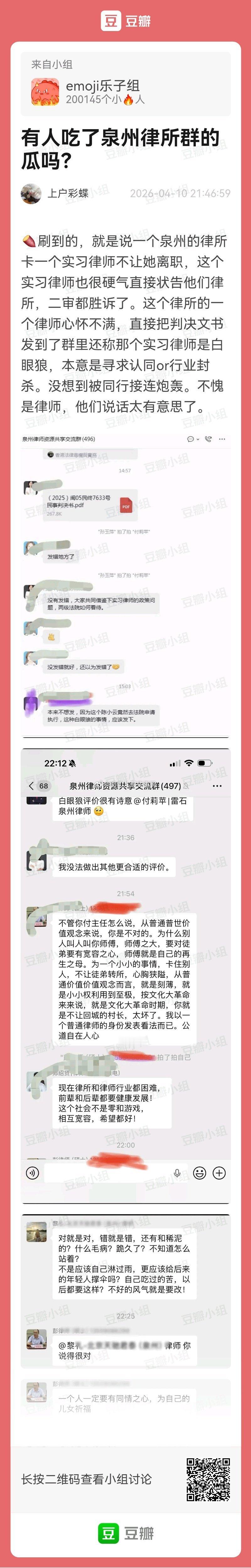 🈶人吃了泉州律所群的瓜吗?🍉🍉就是说一个泉州的律所卡一个实习律师不让她离职,这个实习律师也很硬气直接状告他们律所,二审都胜诉了。这个律所的一个律师心怀不满,直接把判决文书发到了群里还称那个实习律师是白眼狼,本意是寻求认同or行业封杀。没想到被同行接连炮轰。