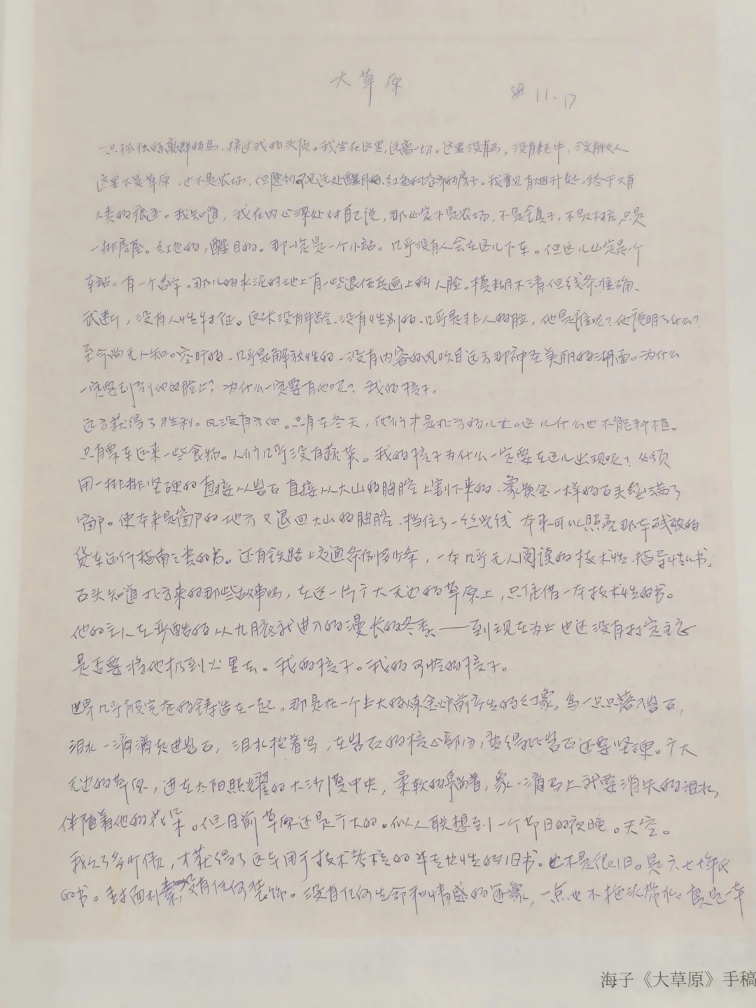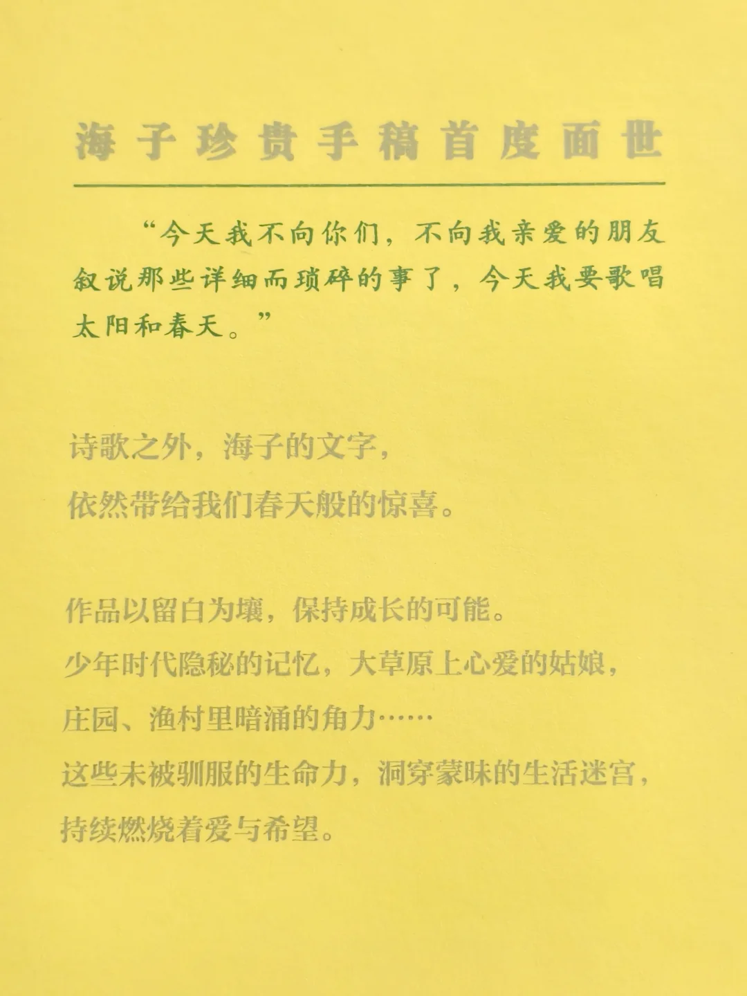 书内收录了《少年时代》《大草原》《庄园》等十篇小说和散文,全是首次面世的手稿。翻开书页,我看到一个穷乡僻壤走出的少年,偷家里的鸡蛋换小人书,为买一本心爱的书从米袋里省米、饿着肚子卖米换钱。诗歌之外的他不光鲜、不完美,却那么鲜活。还有大草原上心爱的姑娘、庄园渔村里暗涌的角力…每一篇文字都带着海子独有的气质:热烈、精确、直击人心。