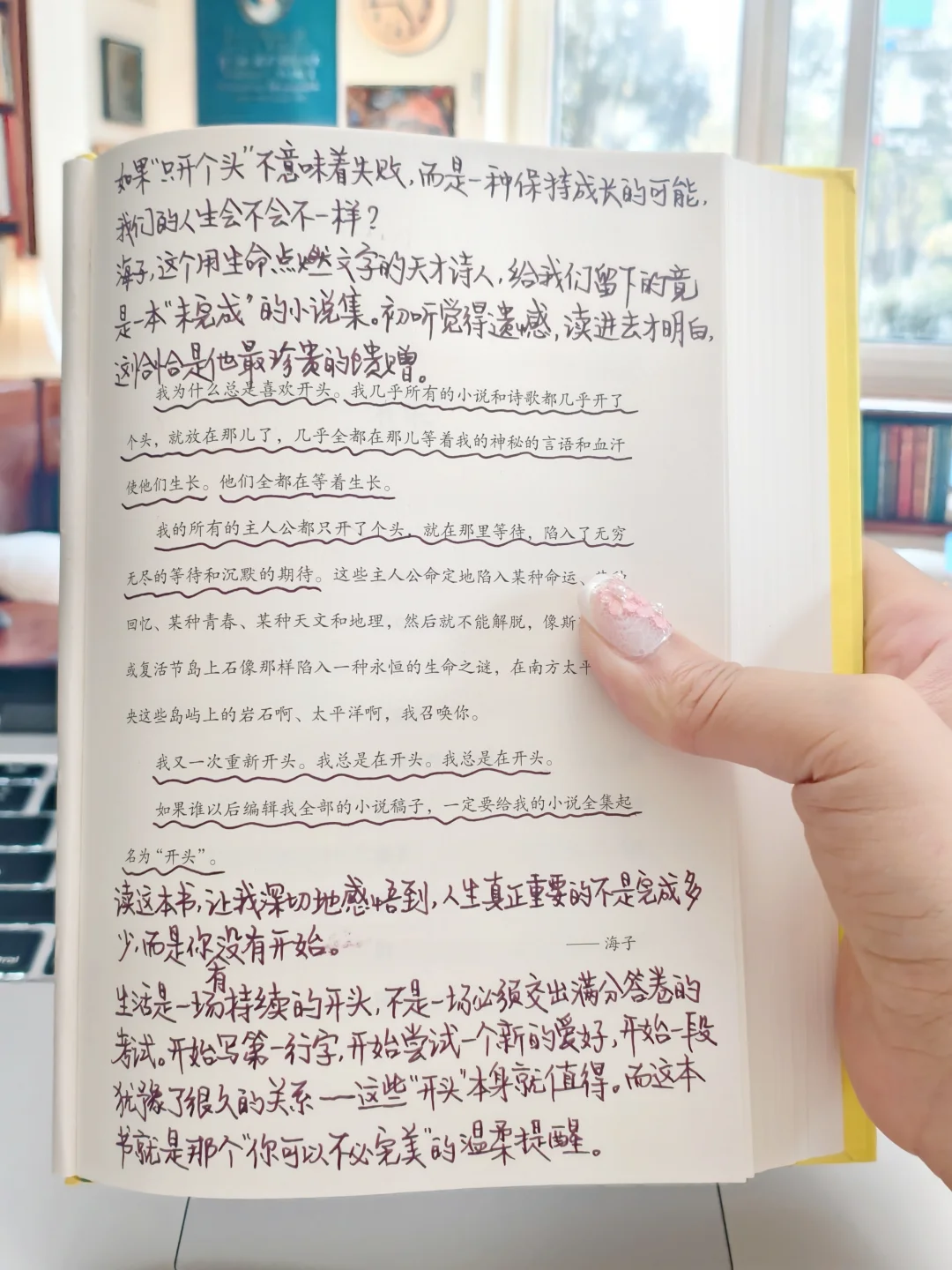 可海子告诉我们:只开个头也可以。书里最打动我的不是精心雕琢的情节,而是那种“悬而未决”的状态——回忆的绝望、生活的矛盾、漂泊的孤独…他不提供答案,只是诚实地把过程摆在你面前。那些未完成的手稿,像一个个开口的容器,等待每个读者用自己的生命体验去填满。