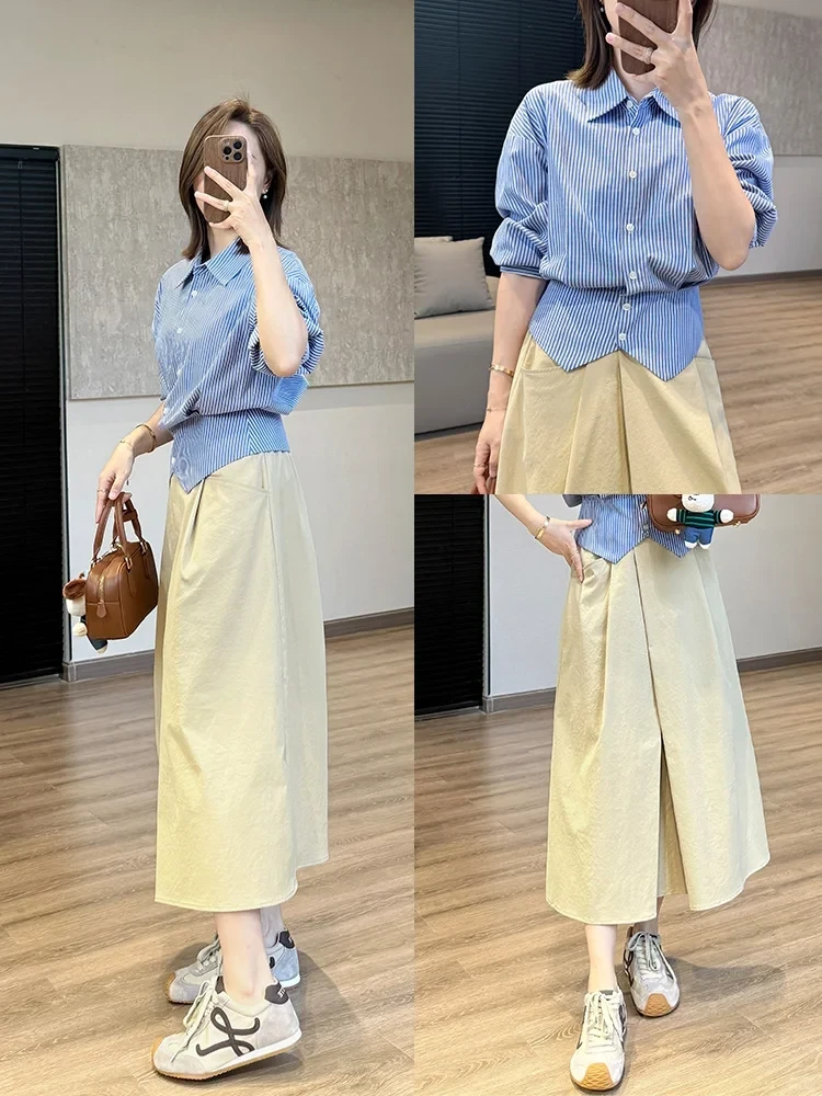 被章小蕙这身穿搭狠狠种草!经典黑衬衫搭配浅蓝花苞半身裙,简约不简单,藏肉显瘦
