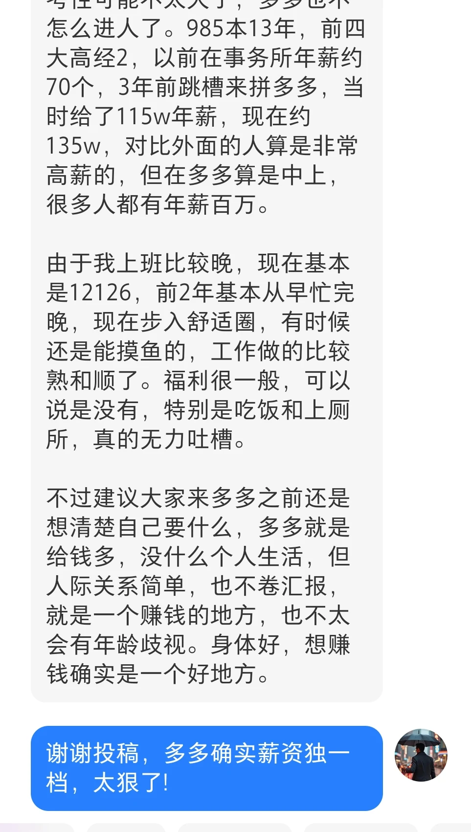 不过建议大家来多多之前还是想清楚自己要什么,多多就是给钱多,没什么个人生活,但人际关系简单,也不卷汇报,就是一个赚钱的地方,也不太会有年龄歧视。身体好,想赚钱确实是一个好地方。