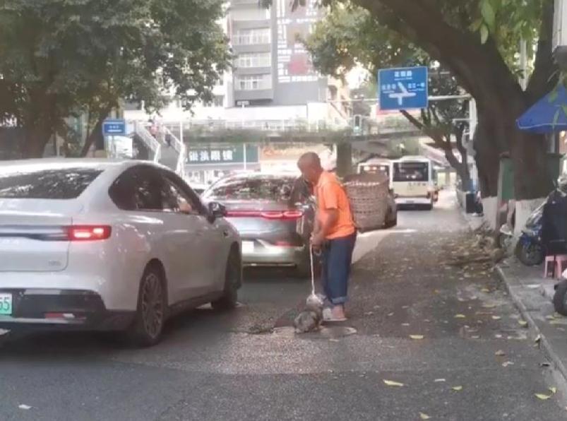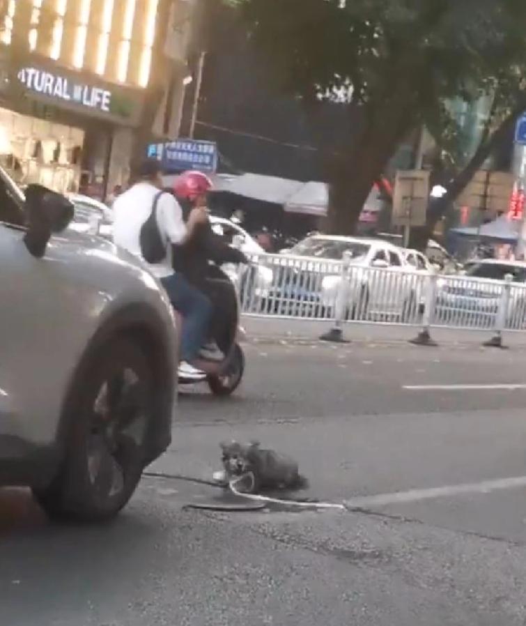网上流传四川一条影片,一名中年男子疑为碰瓷揾食,竟将绑著狗绳的毛孩掷向正在行驶的汽车,痛得狗狗大叫。