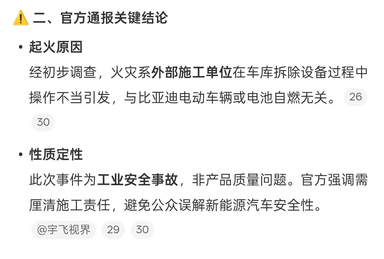 目前看到的原因是火灾系外部施工单位在车库拆除设备过程中操作不当引发,与比亚迪电动车辆或电池自燃无关。总有人想搞个大新闻,造谣的注点意吧。