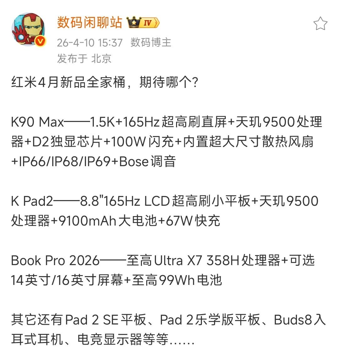 数码闲聊站 K90 Max官宣定档!4月21日19:00!主要配置,天玑9500+D2独显芯片,1.5K 165Hz高刷直屏,100w快充,内置主动散热风扇,BOSE调音等!还有平板,耳机,笔记本全家桶等新品!