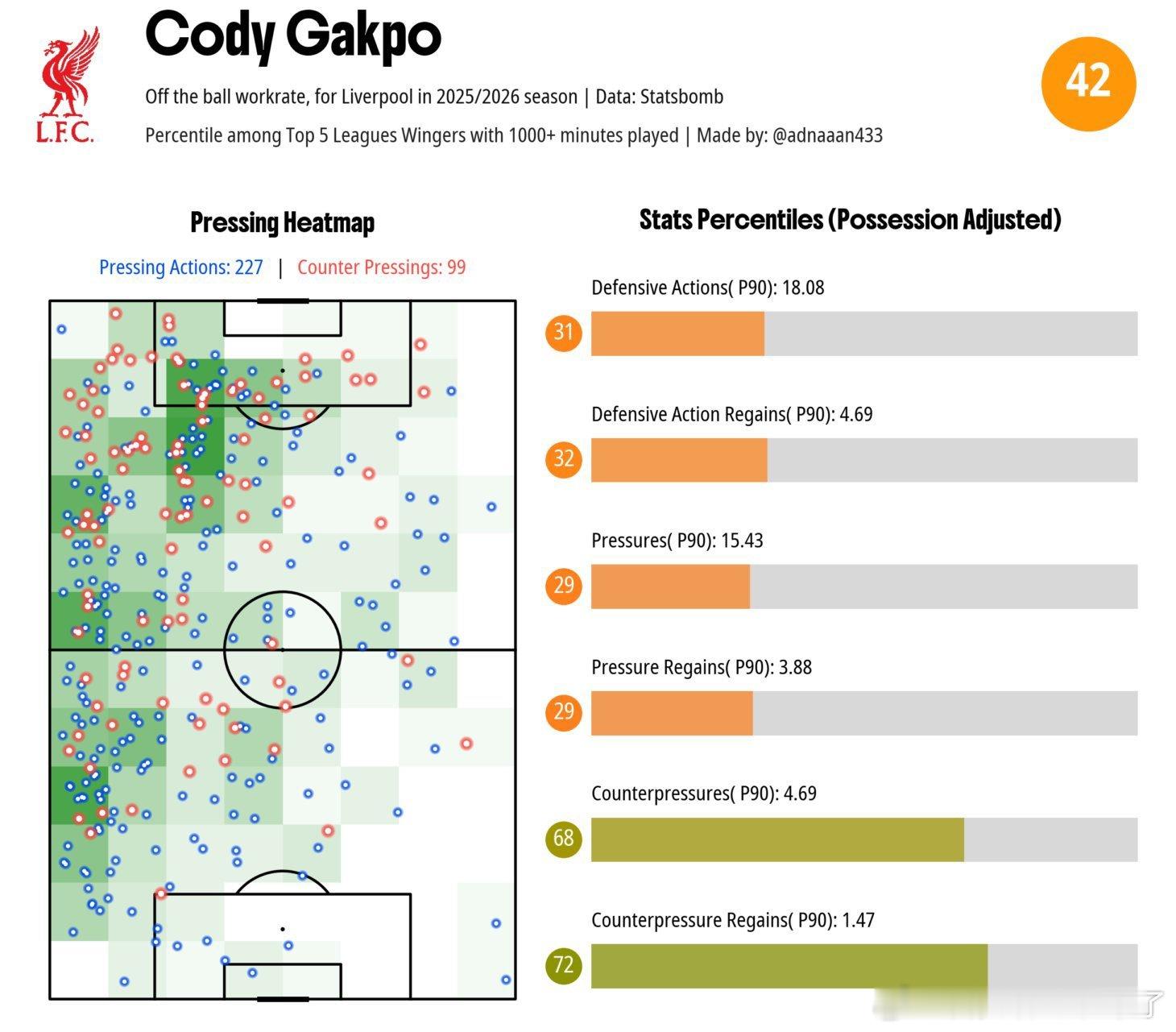 ◦ 加克波的无球数据表明,他在场上可能更依赖于其有球技术、传球和射门来贡献,无球压迫并非其核心技能包。利物浦