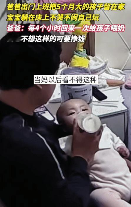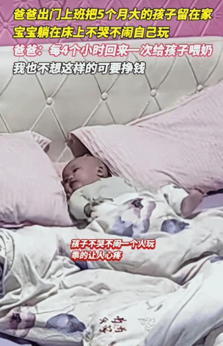看哭了!男子出门上班,把5个月大的孩子独自留在家里。没想到,孩子躺床上不哭不闹,很乖。男子说: “每隔4个小时回来一次,给孩子喂奶。我也不想这样,可要挣钱。”网友说:“不是不哭不闹 ,是开始哭,没人理,久了知道哭没用,所以才不哭!”