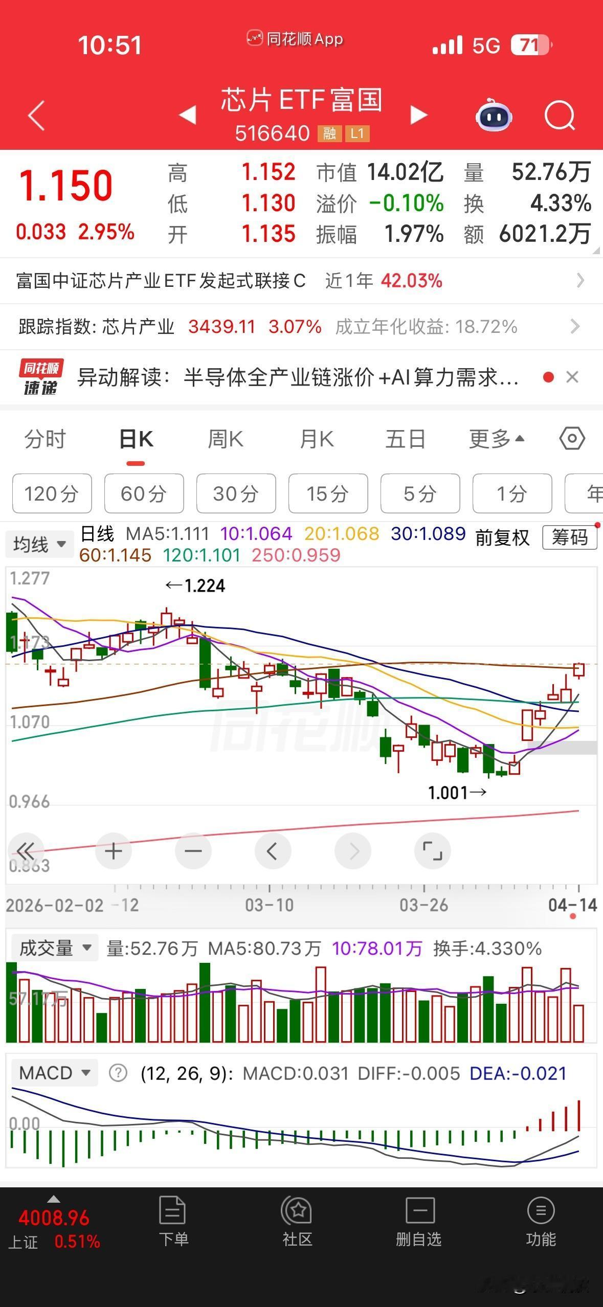 再说说半导体板块,超预期的强,自从我们在底部抄底以来,已经反弹15个点,12个点清的仓,原本打算回调之后再操作,没想到直奔目标点位去了。