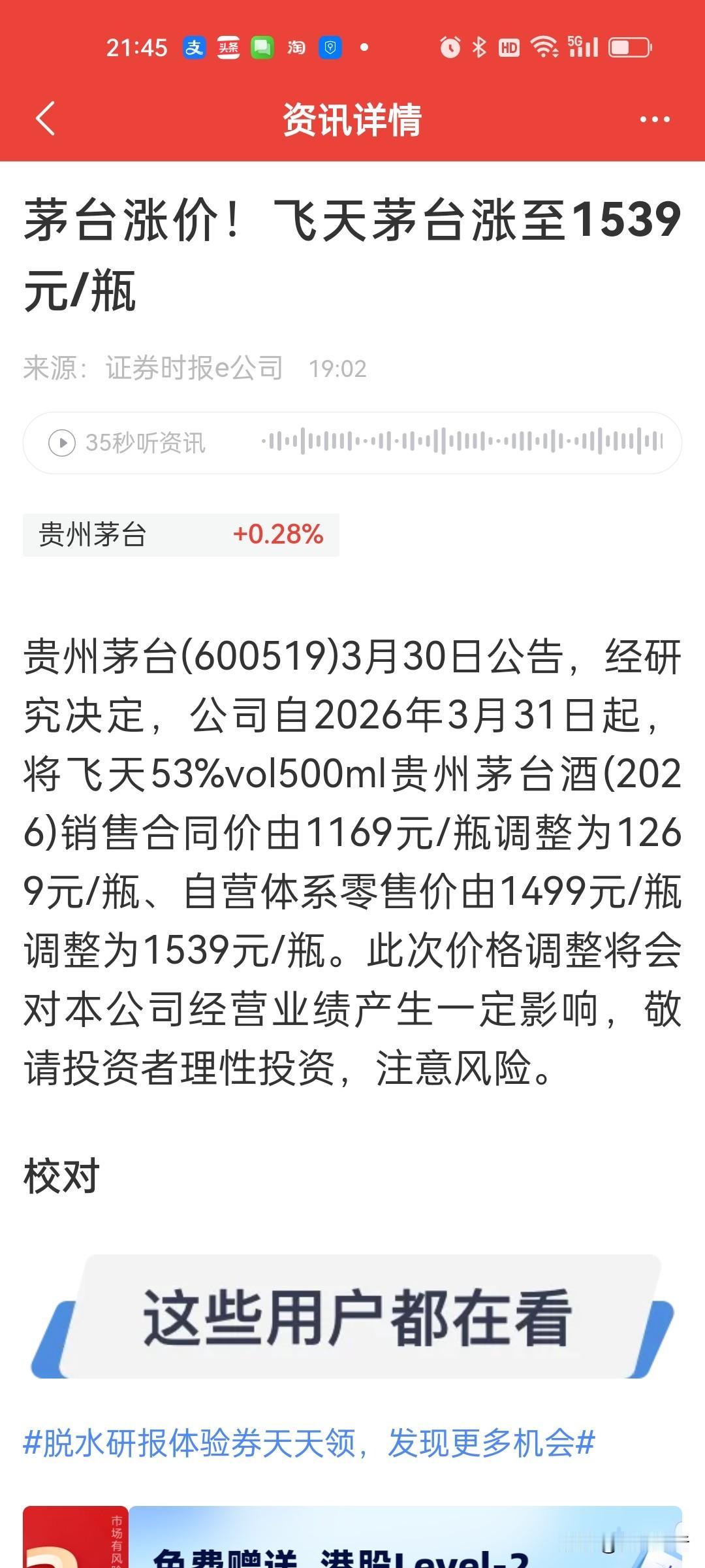 时隔两年半,茅台又提价啦!出厂价从1169元提高到1269元,这次零售价也做了相应的调整,i茅台申购价格从1499元提升到1539元。