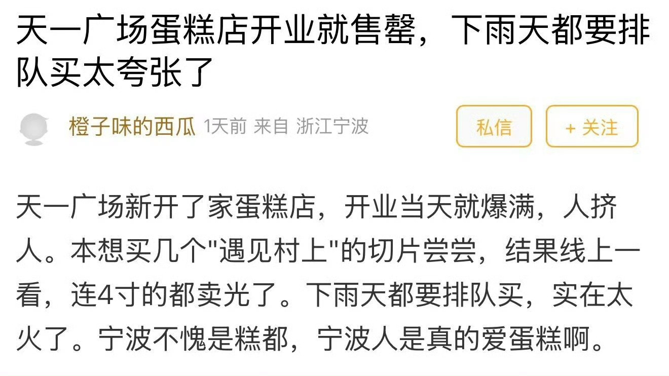 来宁波的新店开业都会排长队能坚持多久呢 ❓天一广场的又一家新店开业,依旧是大排队宁波人对新开的店是不是都有天然好感都要立刻尝一尝据说是一家实惠的蛋糕店,看网上其他城市也有一些吐槽…开业爆火的店在宁波并不少,不知道一段时间之后,这家店是否还能保持现在的热度呢?