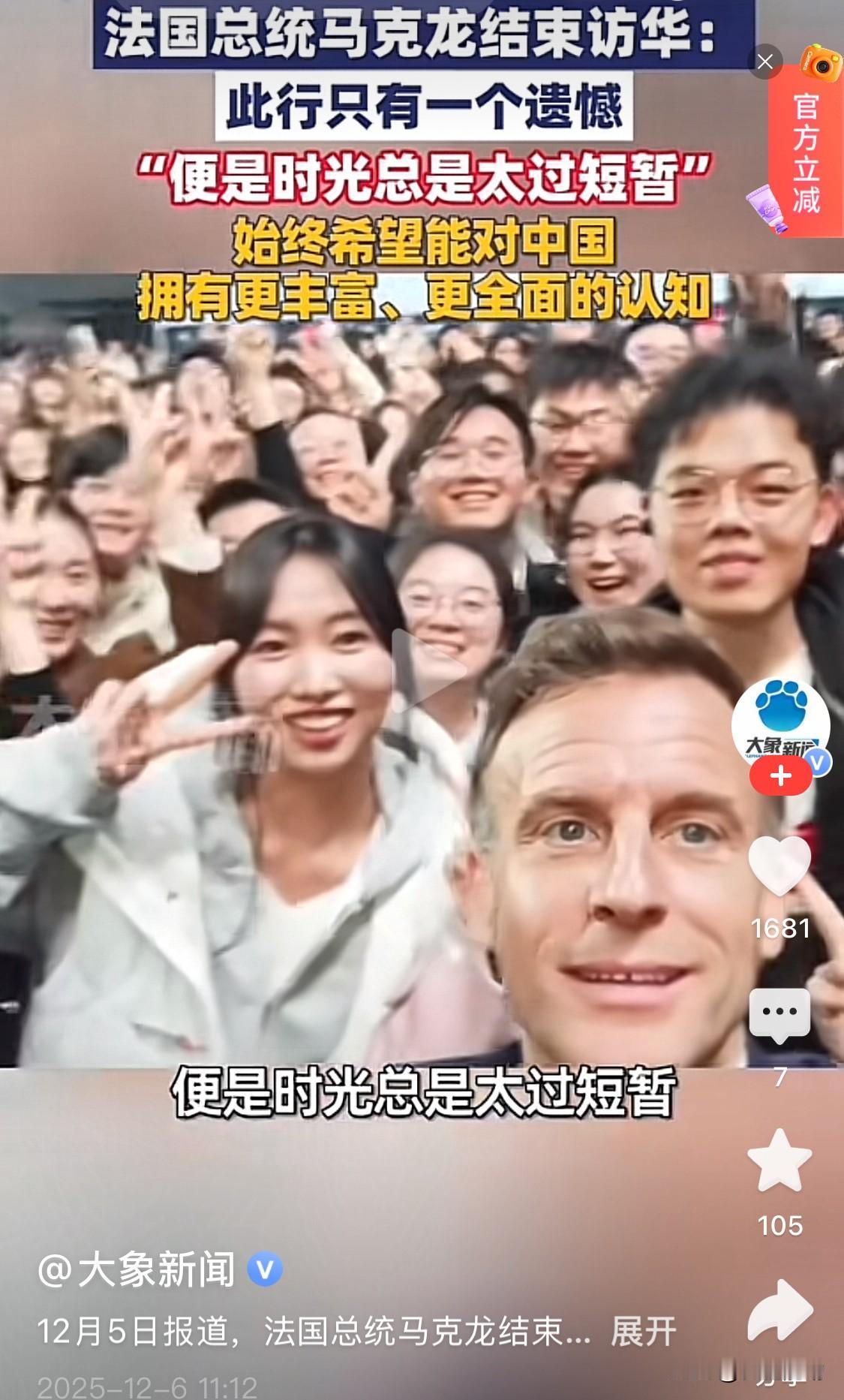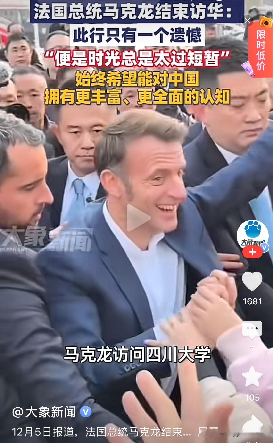 从马克龙早晨在锦城湖跑步与民众打招呼,到都江堰看迄今为止仍然发挥作用的2000年前的水利工程,再到四川大学与学生的互动……成都的每一个“符号”都获得极大流量。成都作为国内发展最好的城市之一,作为超级网红城市,以美景、美食、美酒、美女以及休闲文化为特色,给马克龙及观众留下了美好印象。所以,马克龙在离开之际说,此行只有一个遗憾——“便是时光总是太过短暂”。可见,马克龙对成都的热爱与不舍。