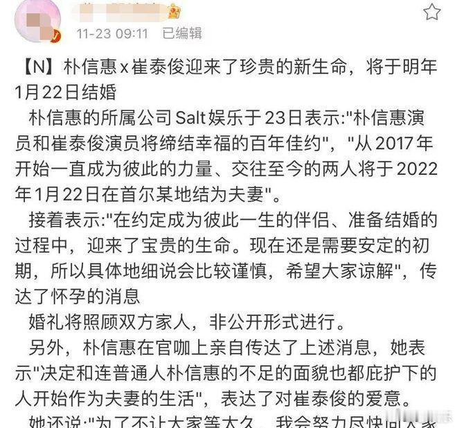 男神收割机突然刹车 对象竟然不是李敏镐韩国娱乐圈再度引发轰动了,这回并非源于新电视剧开始播出,而是身为我们口中“韩剧女王”的朴信惠陡然抛出红色炸弹了。她于自身社交平台之上进行官宣,称将会和演员崔泰俊在明年1月22日步入婚姻殿堂,并且其腹中已然怀有了小宝贝。