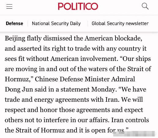 外媒报道,中方对美方强横封锁霍尔木兹海峡的举措不予理会,将继续履行与主权国家伊朗
