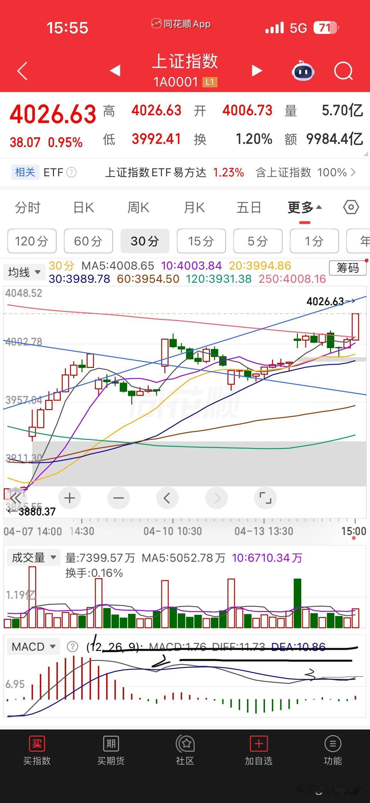先别着急高兴,4026点只是敲门砖,到了这个位置只是具备了暴涨的条件,但是真正想达到这个目标,还要看明天给力不给力,毕竟今天只是碰了一下60分钟的上升通道而没有突破。