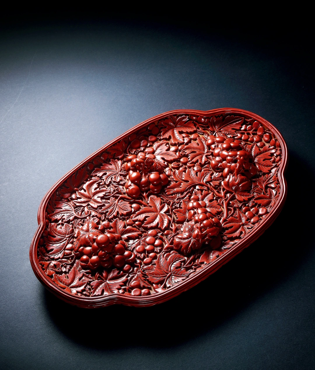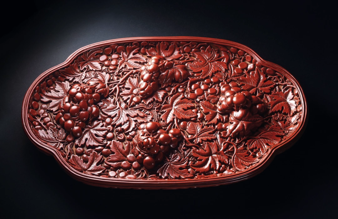 元 剔紅高浮雕葡萄紋海棠式盤