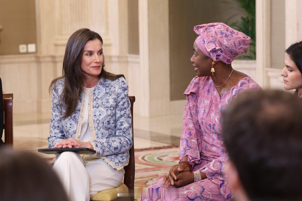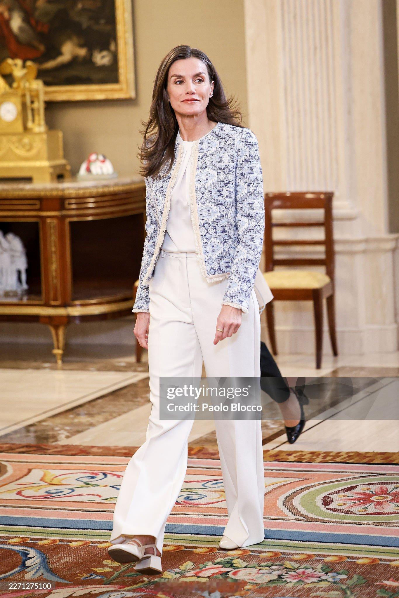 4.14 西班牙王后莱蒂齐亚出席接待会和参加会议。mango上衣最早见于2013年,上次穿是2015年,mango这面料材质能放这么久也是一段佳话