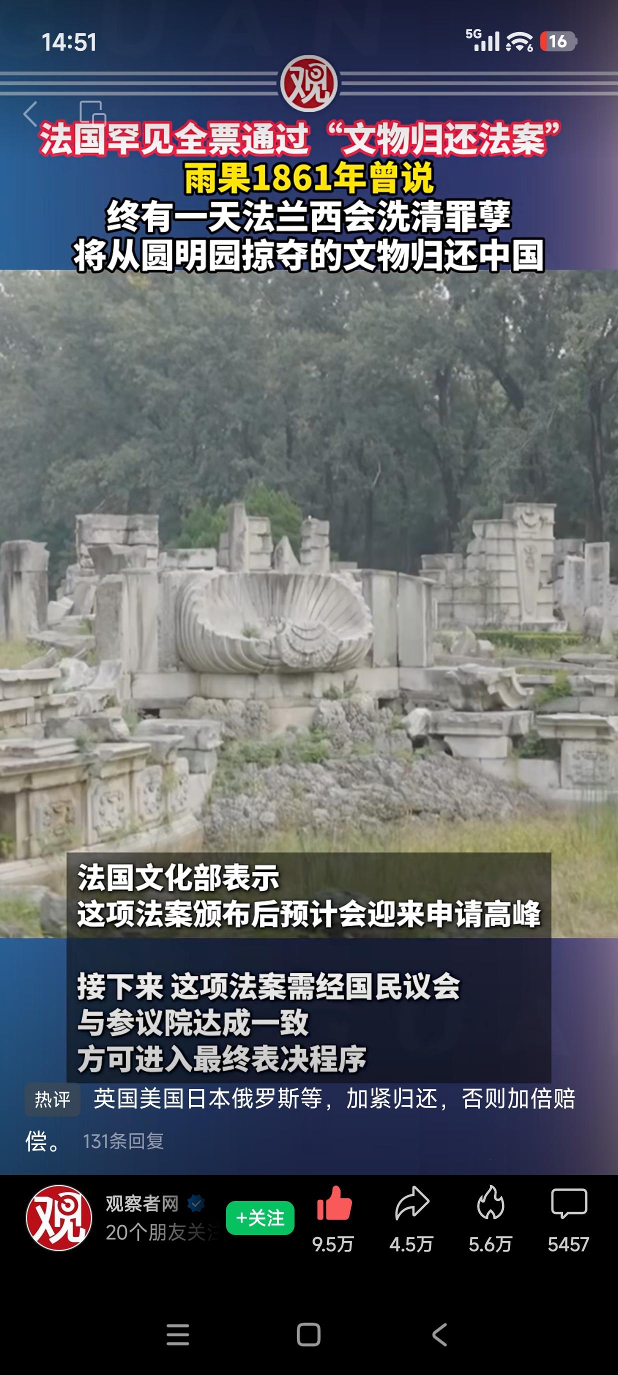法国全票通过文物归还”赎罪案”。法国藏有260万件中国文物…[捂脸哭]4月13日