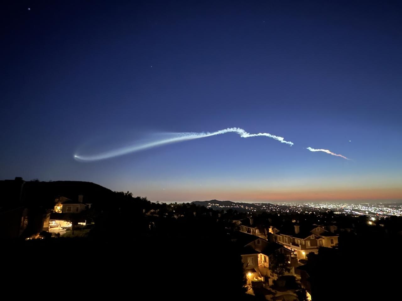 由于这次发射正好处于日落后的黄金窗口,火箭在高空排出的废气被地平线下的阳光照亮,形成了壮观的“暮光效应”。这种像“发光大蝌蚪”一样的轨迹划破夜空,确实是美西居民专属的宇宙级浪漫。顺便说一句,最近的发射窗口都在日落后一小时左右,未来几天还会持续看到!