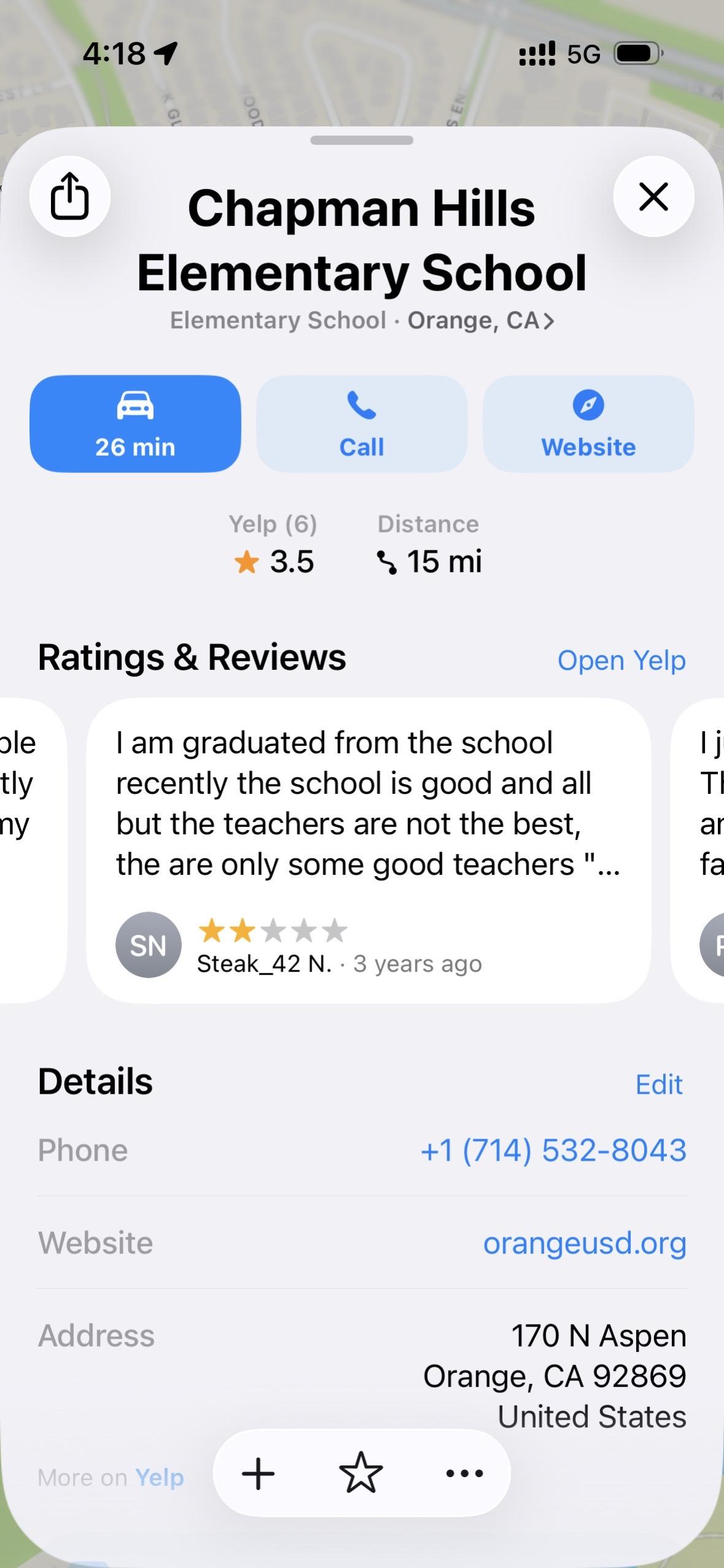 看图三和图四,一所在专业网站上评分很高的小学,被几个毕业的孩子打上了差评,学生说:老师真不咋地,这些评论就像是这所学校的耻辱,被永远的刻在了苹果地图里,无法被删除。这就是 Yelp 的刻薄:它宁可保留“刺耳的真实”,也不允许“好看的假象”。
