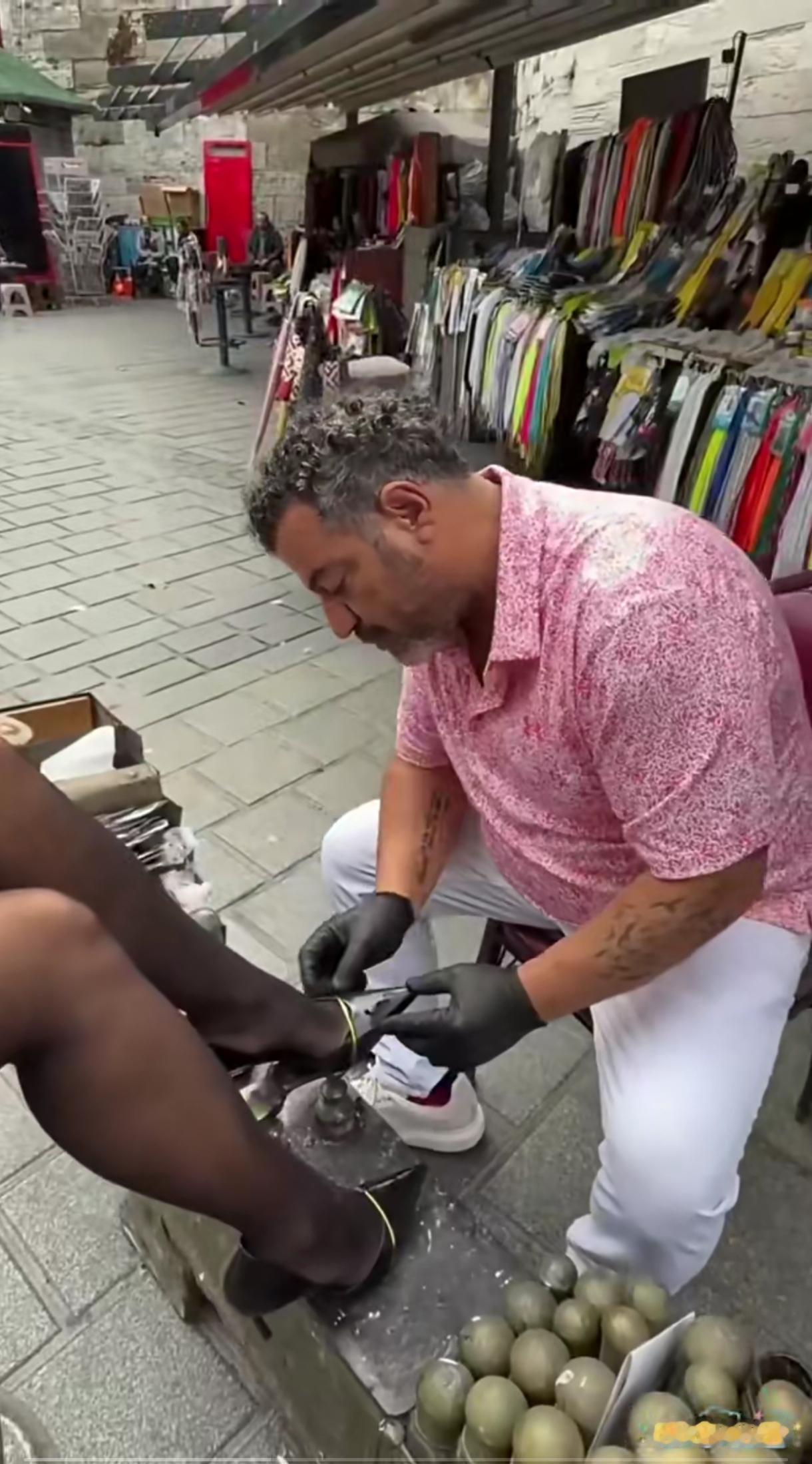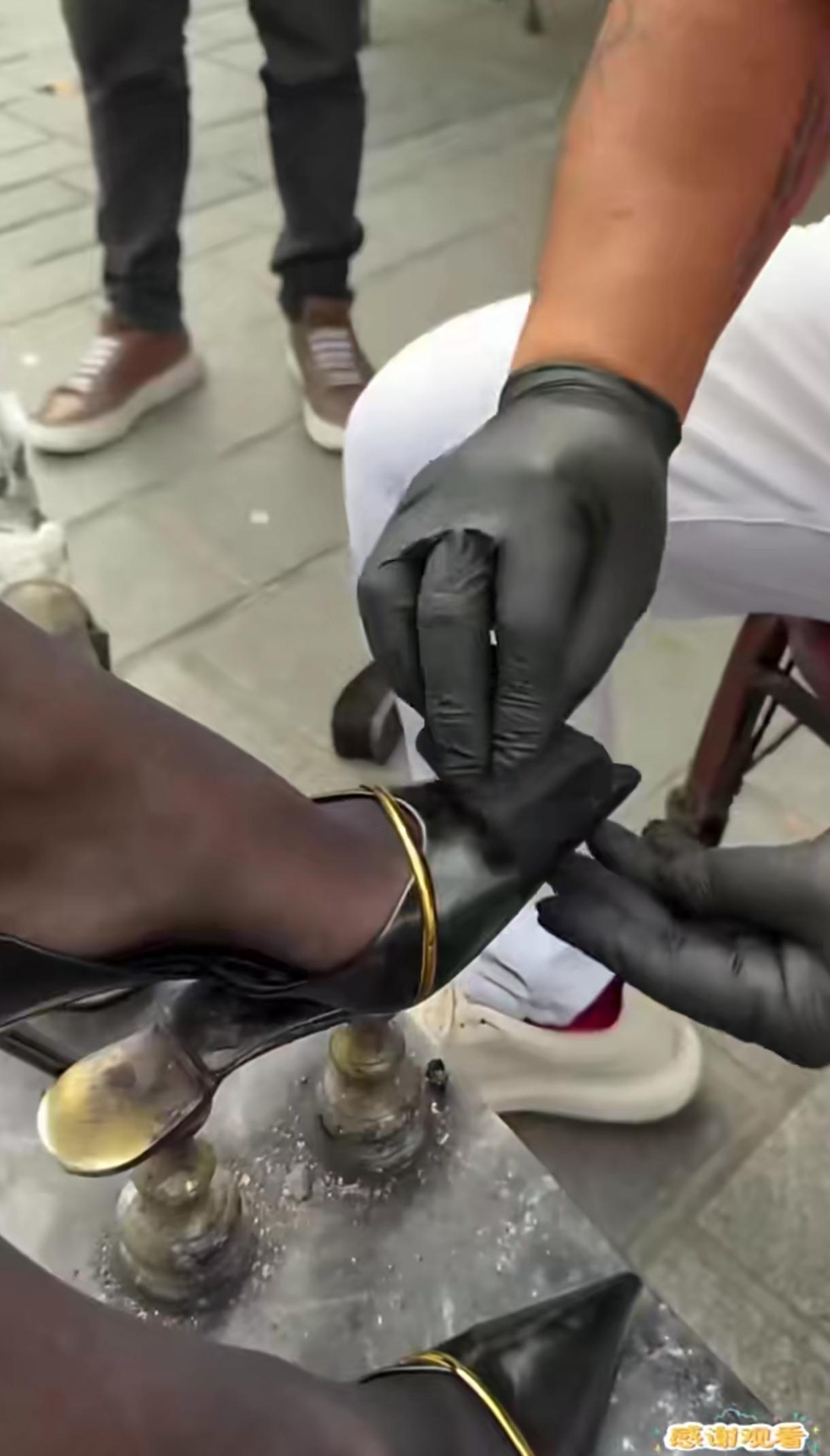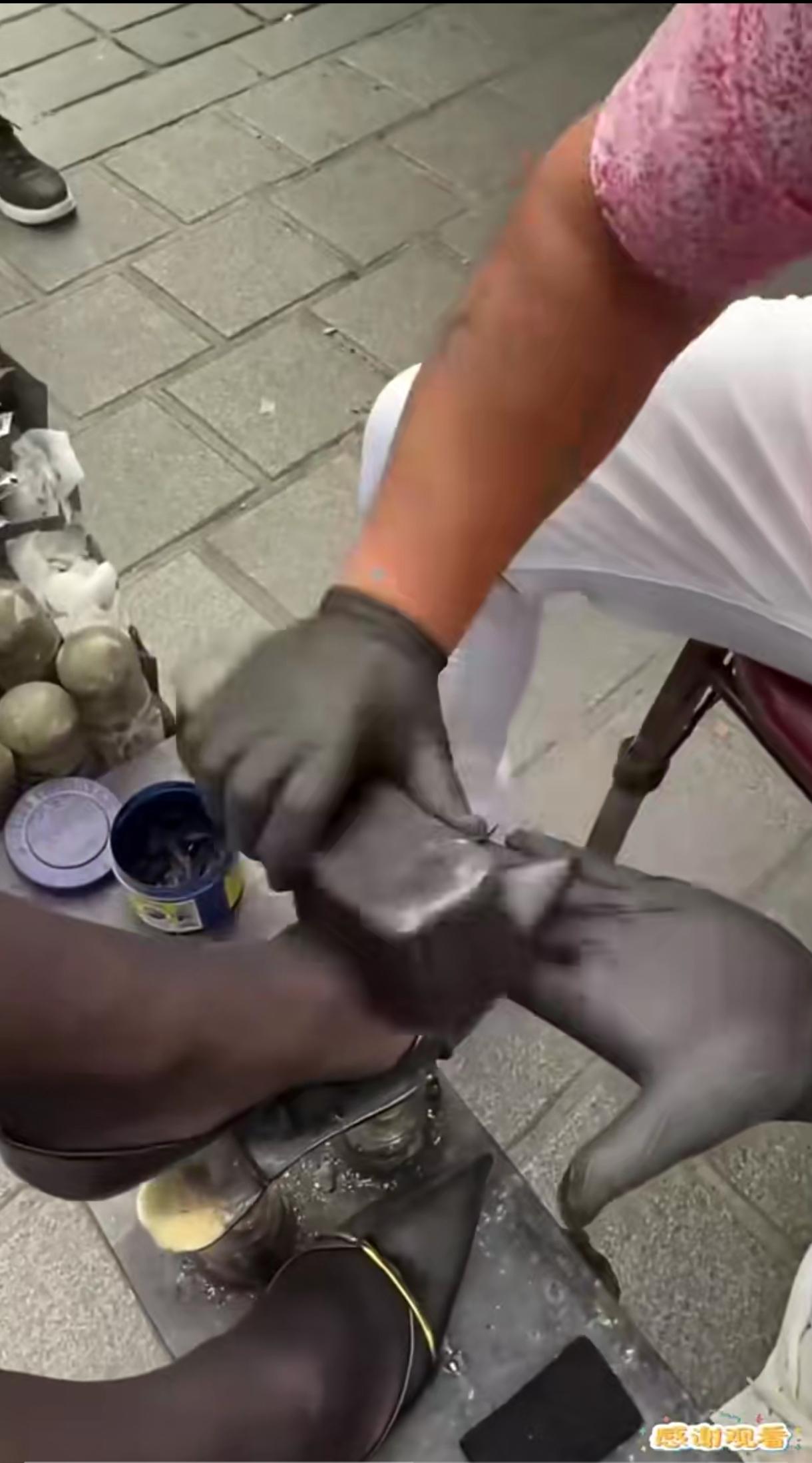 不像印度,是埃及吧。不做保护吗,都擦到鞋子外面了,丝袜连着脚面都擦黑了!擦皮鞋的