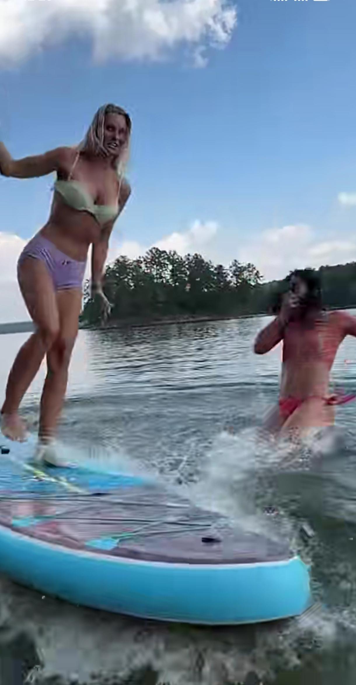 两位健美女郎,看谁站的住,站的稳,左右摆,幅度大,比拼重心控制力。最后欢欢喜喜掉水里了,开心。