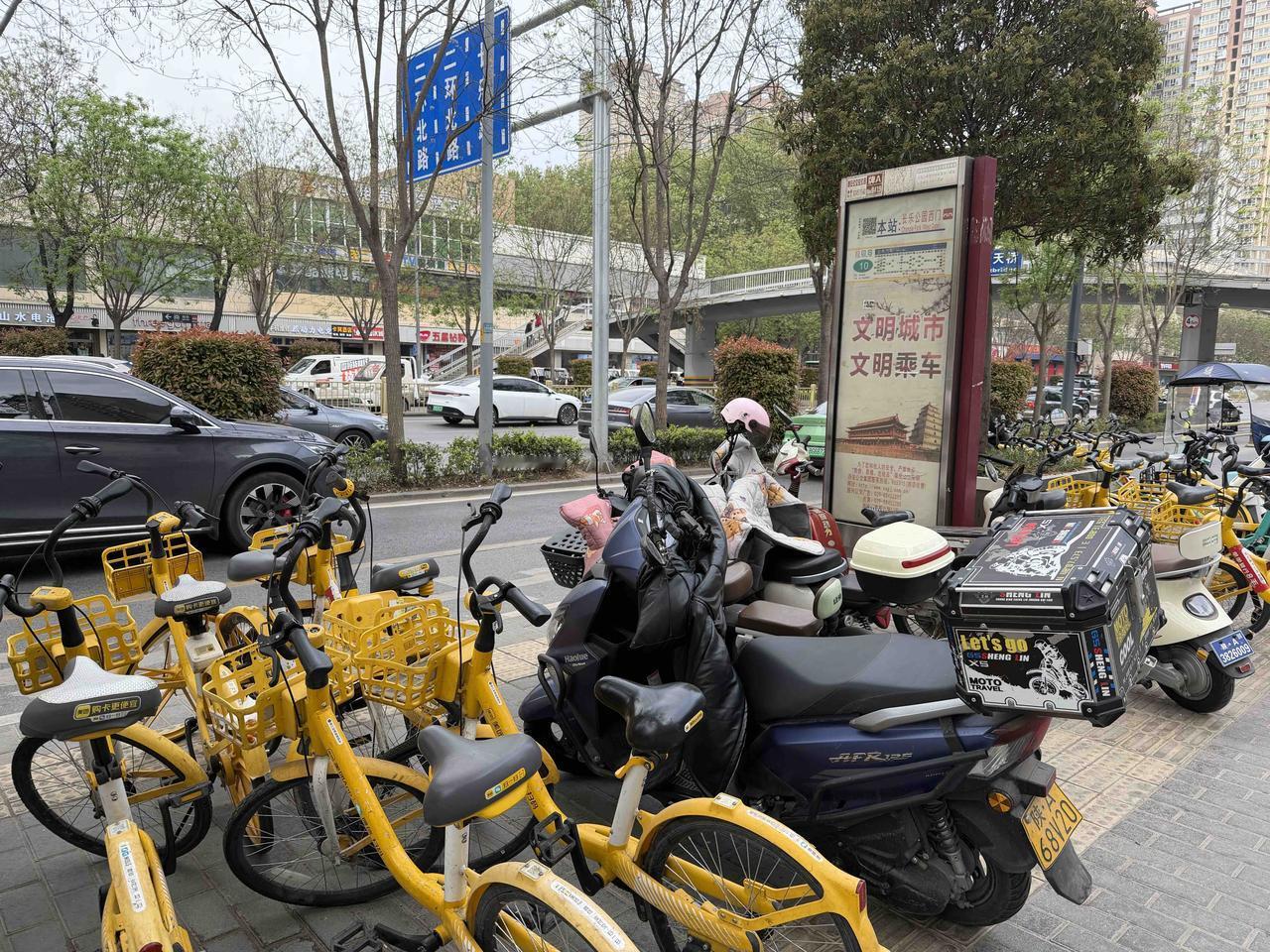 我到公交车站时,看到站牌两边,停满了电动二轮车和共享单车,人从人行道上,根本无法走到站牌前去等车。
