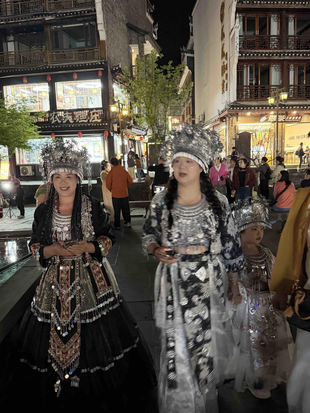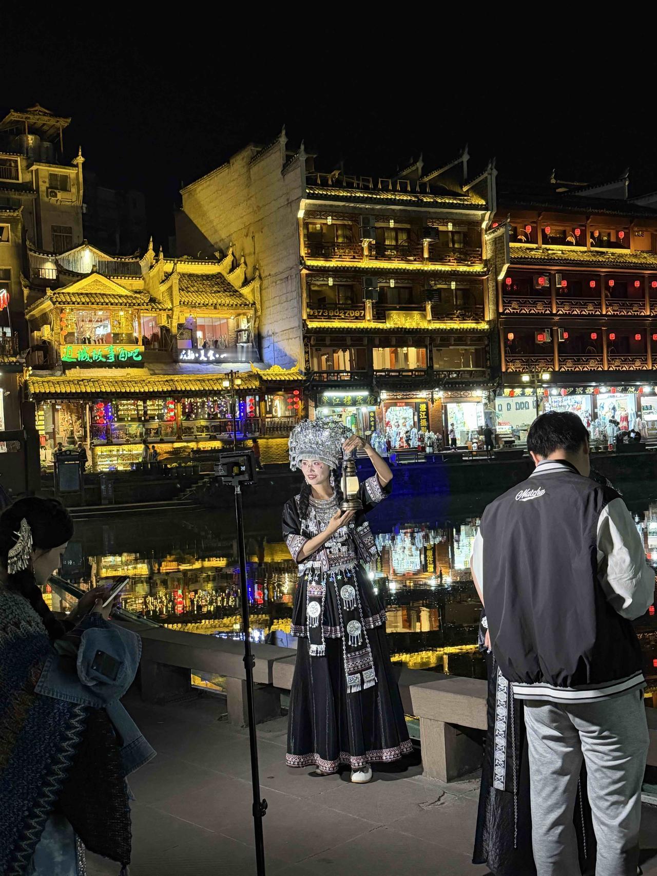不少年轻女游客,租了鲜艳秀丽的苗族服装,穿上请摄影师,在沱江边拍照,要把凤凰古城独特的美带回家。