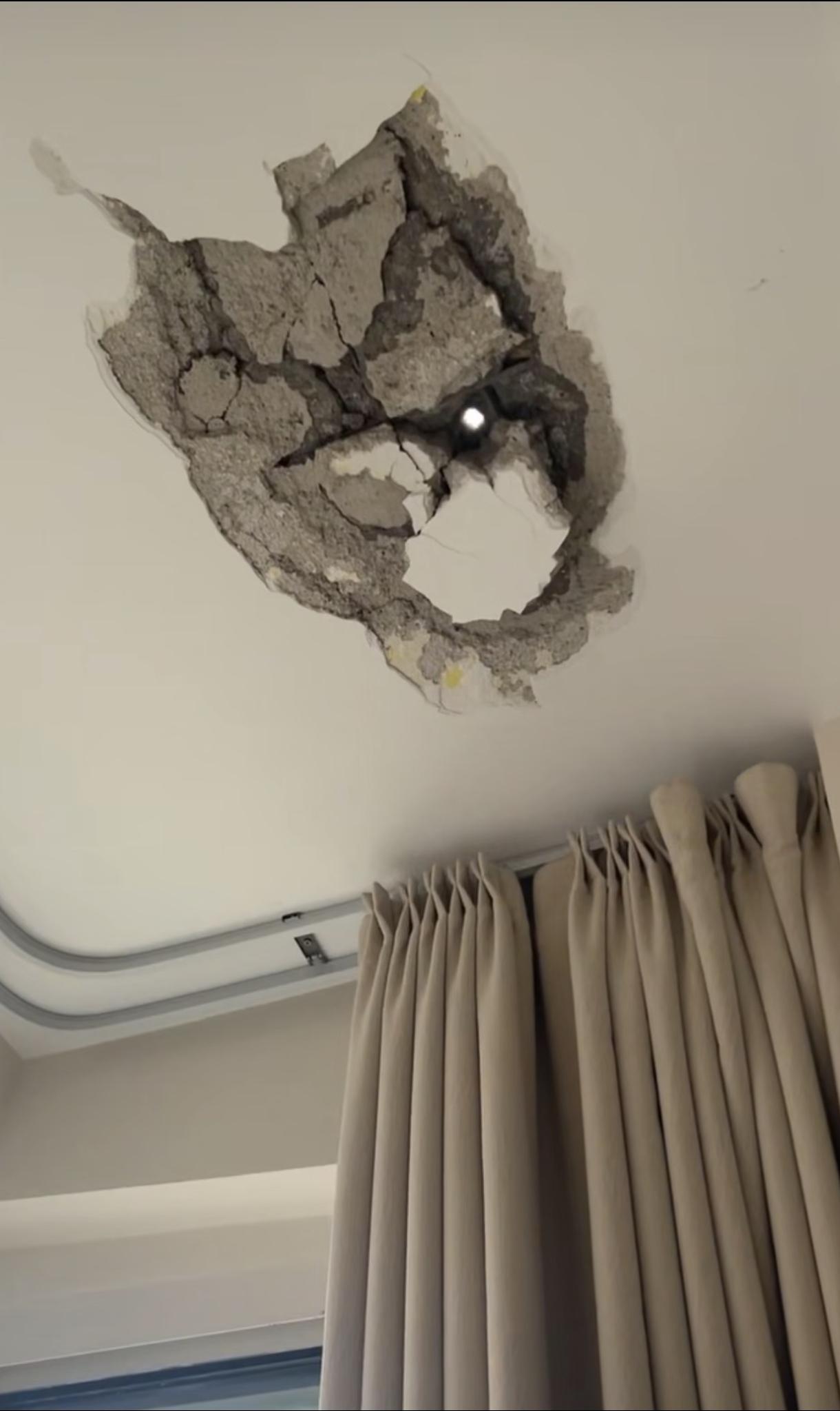 还有王法吗!楼上把野蛮施工,天花板打穿了,这么严重,这是会威胁生命财产安全的行为
