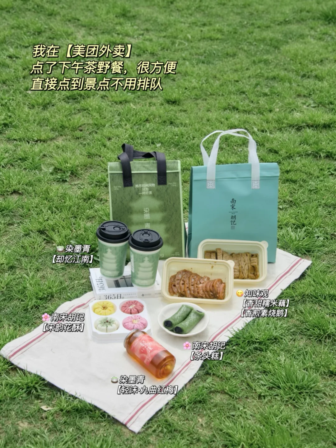 ✔️逛儿累了,可以随时在植物园的草坪、长椅上小憩。渴了饿了,可以打开美团外卖,点一份杭州风味·春日限定下午茶,直接送到景区门口!实现轻便出行!免排队太舒服了😌