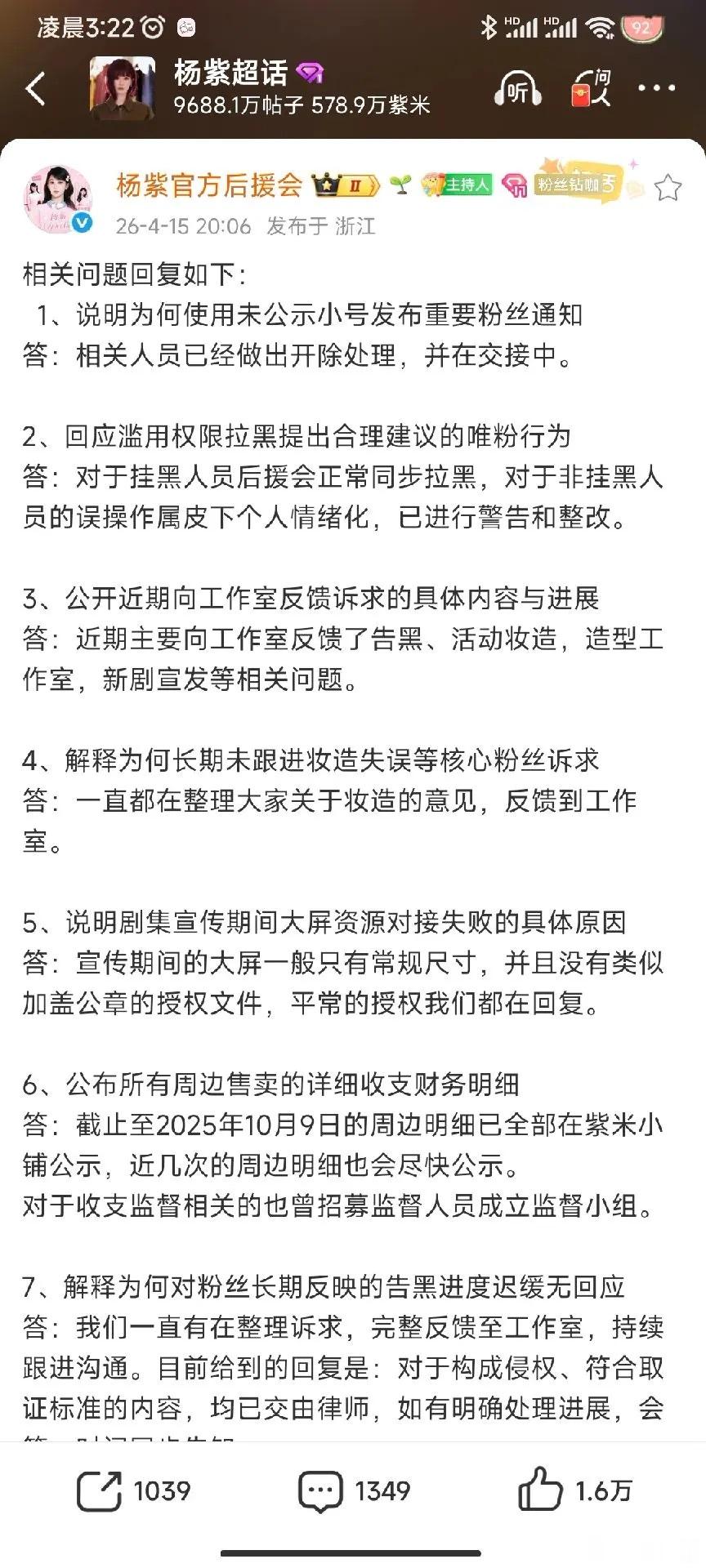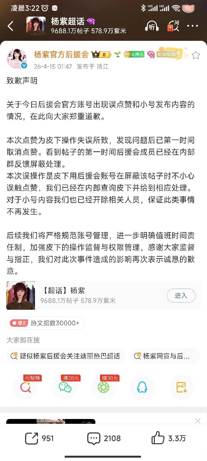 整件事从头到尾,都是后援会账号管理彻底失控,和杨紫本人没有任何关系。从账号操作细