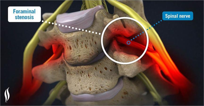 2.慢性原因:椎间孔狭窄是最常见的原因,而颈椎骨关节炎、颈椎退行性椎间盘退行性变化导致附近的骨赘、韧带增厚,这些都会造成椎间孔变窄,神经根的空间就会减少。这种情况下,神经受到刺激的机制并不是真正的机械性压迫,更多是与炎症相关的化学过程。