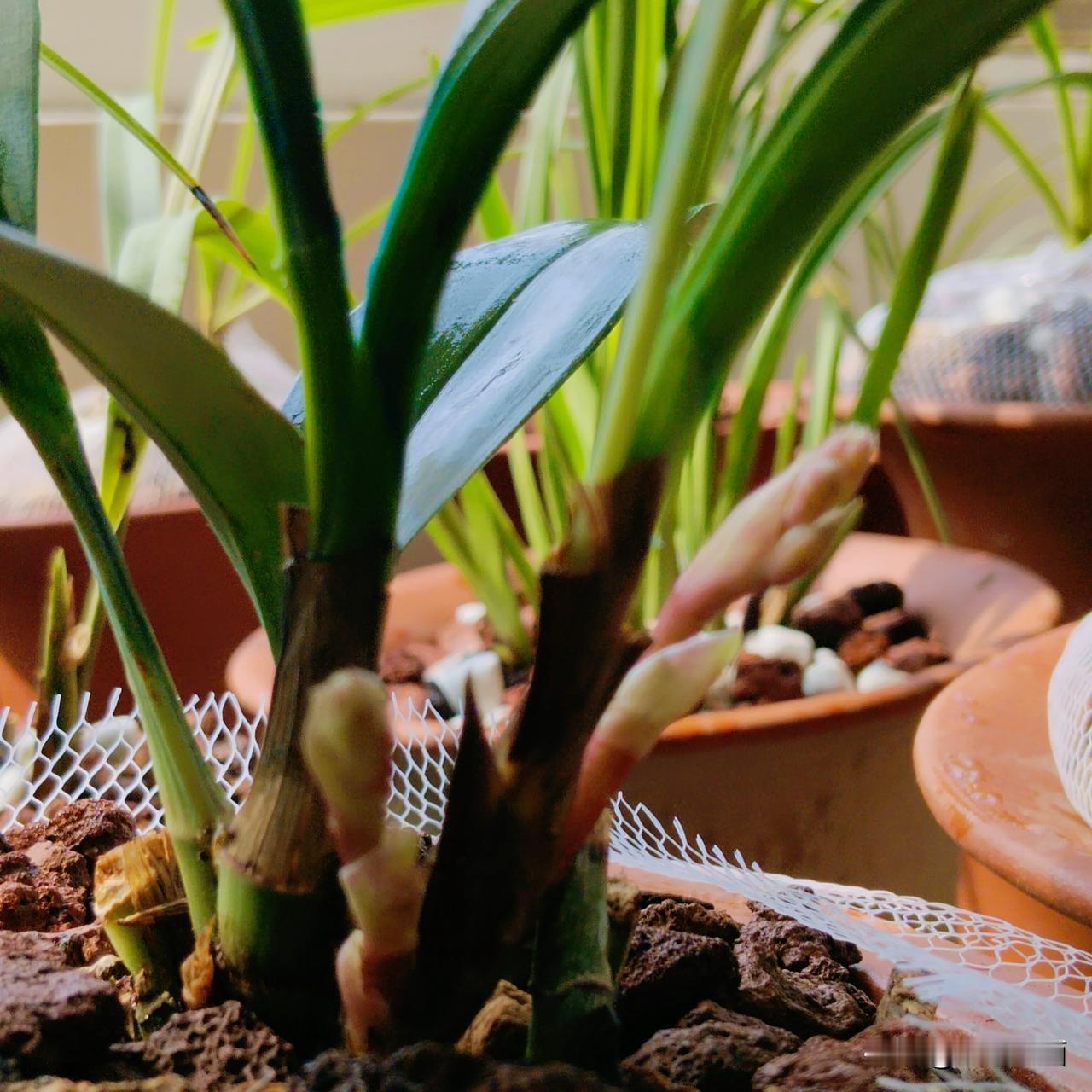 别的兰盆里好多发出新芽。蝴蝶兰更是一片云霞般灿烂,一盆石斛兰也开花了。