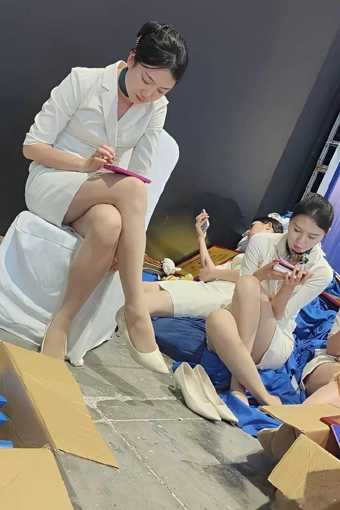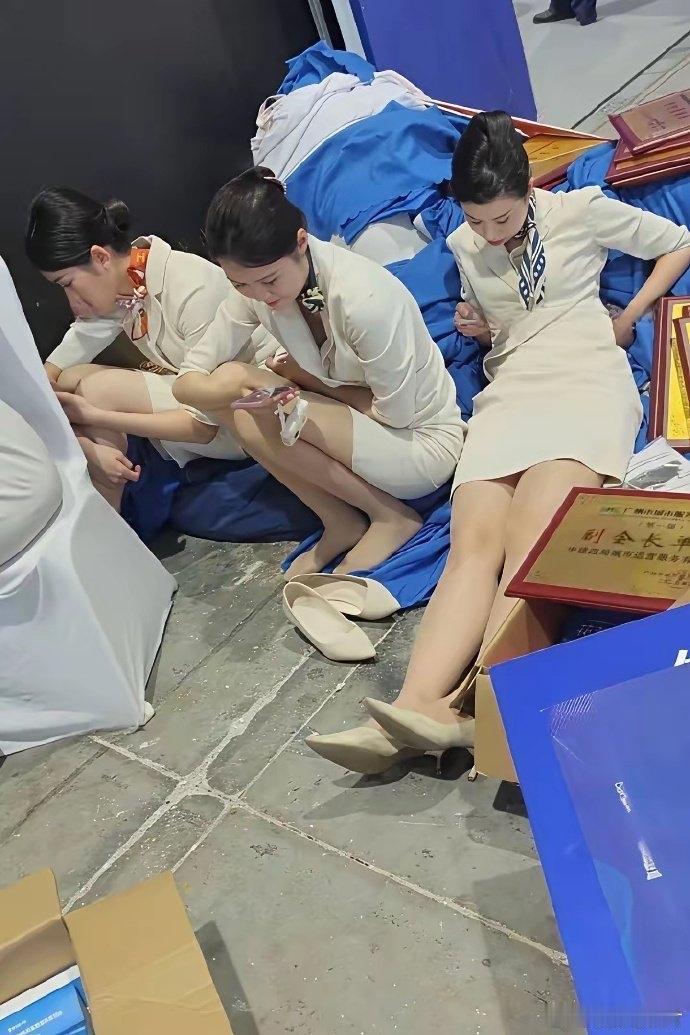 深圳某展会,后台的休息区。没什么职业能简简单单!高强度的体力消耗。这些女孩在镜头前站一天、走一天,脚底板发木、小腿浮肿是常态。这世上本就没有容易二字,只有包装得比较好的狼狈。