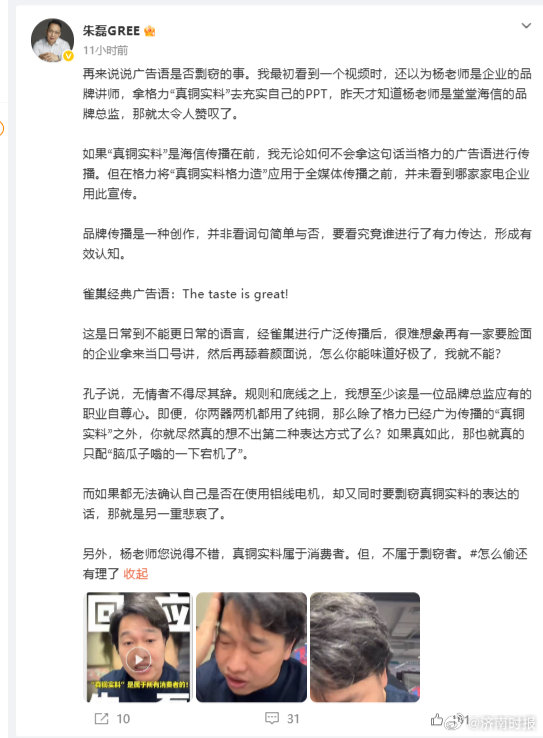 【#格力高管深夜五连击海信#】4月15日深夜,格力电器CMO朱磊在社交平台连发五条长文,对海信空气事业部品牌总监杨祥玺此前的言论进行密集回击。