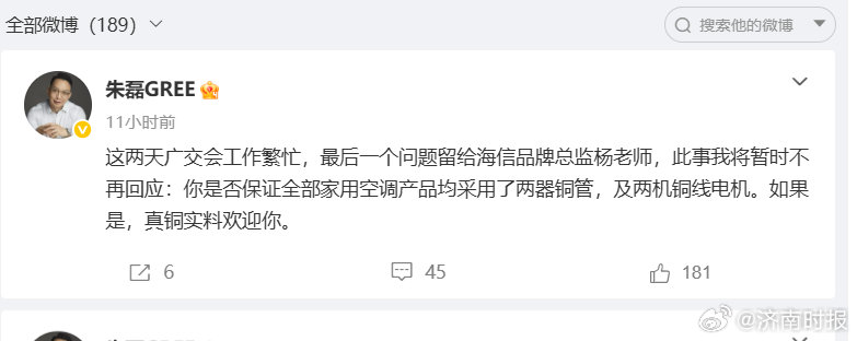 在多条回应中,最具争议性的部分集中在对“真铜实料”范围的界定。朱磊指出,海信相关国际铜业协会证书所覆盖范围主要为“两器”(冷凝器、蒸发器)及连接管铜材,并据此提出讨论:若“真铜实料”仅限于此,是否应同时涵盖风机电机与压缩机电机绕组等关键部件。朱磊进一步表示,如果产品电机绕组采用铝线,则在“全铜标准”的表述上存在讨论空间。(记者杜林)