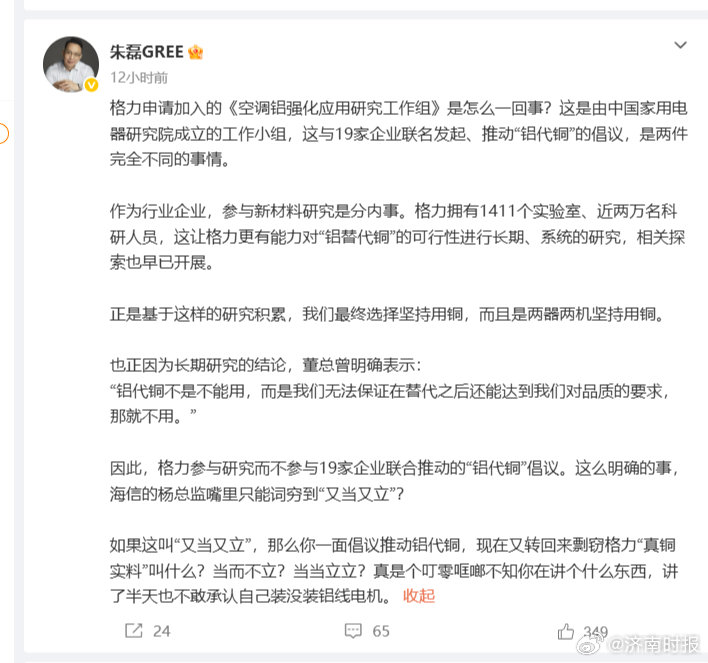 针对海信方面披露格力曾申请加入《空调铝强化应用研究工作组》的资料,朱磊表示,参与新材料研究属于企业正常技术预研行为,但基于内部长期评估结果,格力认为“铝代铜”难以满足品质要求,因此未进一步参与相关行业联合倡议。