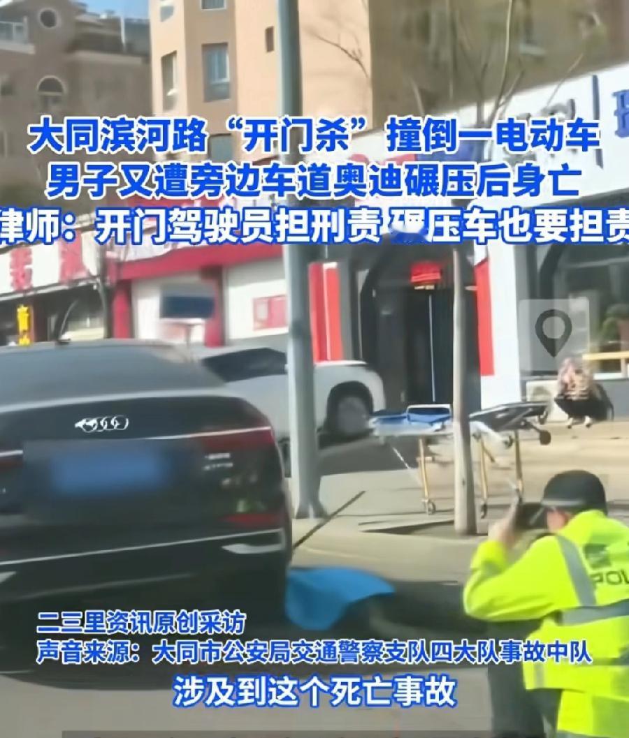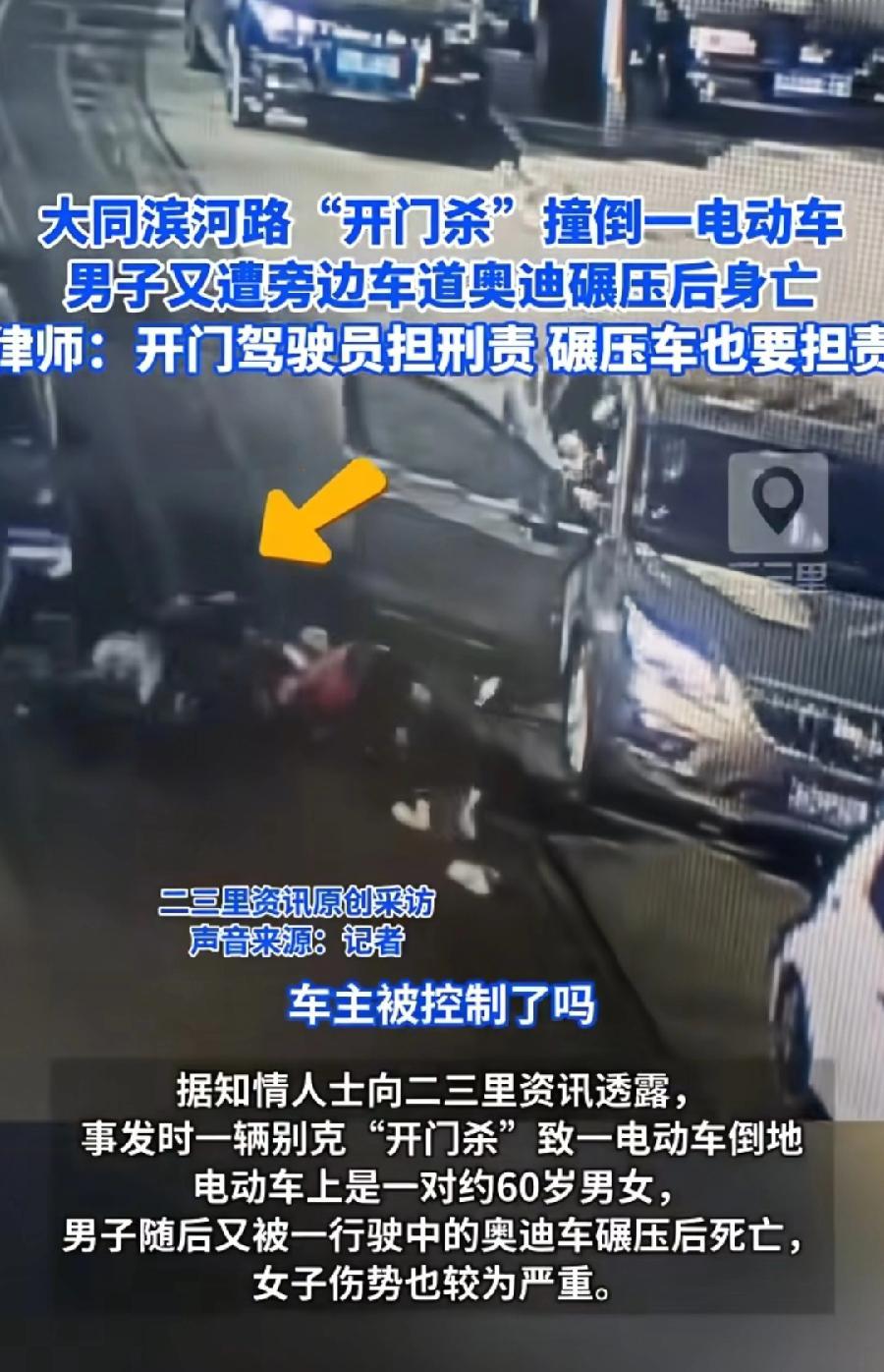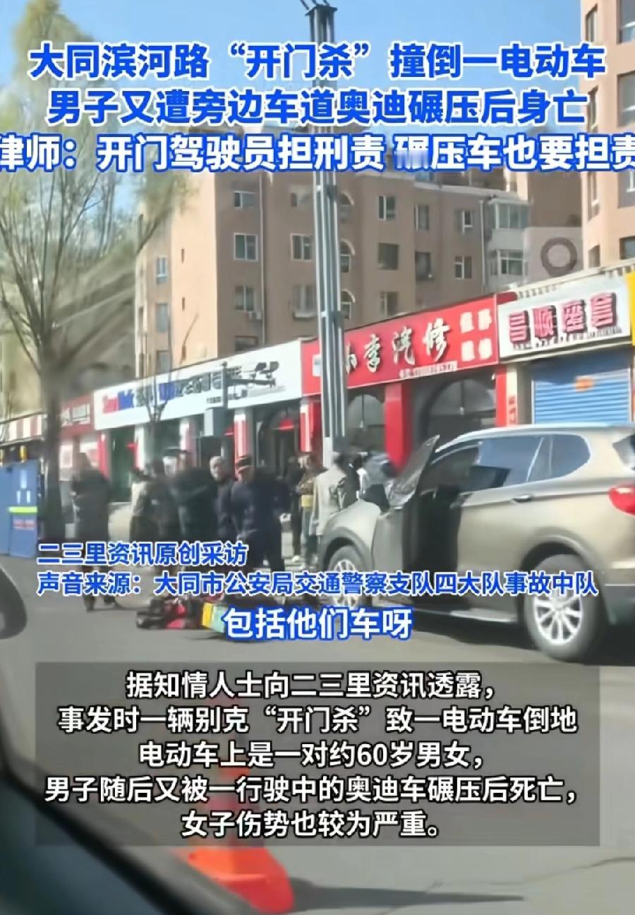 大同1死1伤开门杀,别克司机一个细节疏忽,造成如此严重悲剧事故!奥迪车倒霉,可也有责任,碾压后还拖行了好几米,如果第一时间停车,说不定不至于致死!别克不只是保险赔钱,司机不只是普通交通肇事罪,过失致人死亡罪!必须严惩,警示每一名车主,乘车人!开车门前,一定先拿眼瞅瞅外面,后方路况,注意行人!