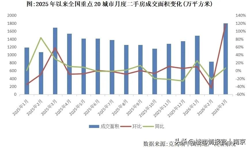 再看二手房,那表现可比新房亮眼多了!3月20个重点城市二手房成交面积直接环比翻倍,涨了117%,同比还涨了6%,一季度累计也同比涨了4%。成都直接杀疯了,单月成交261万方,全国第一;上海、北京、武汉这些城市,二手房成交也都突破100万方。