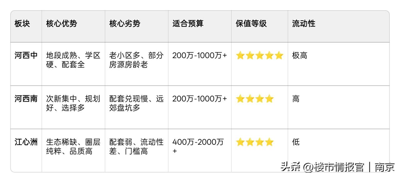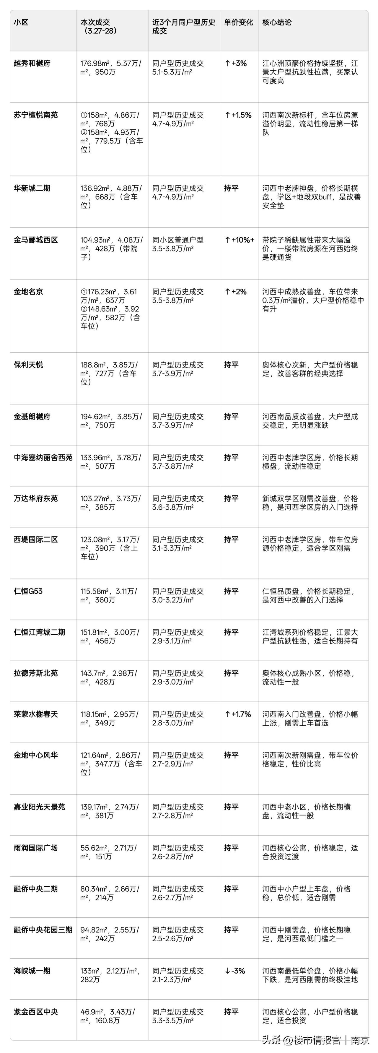 这批成交里,涨价的小区全是2018年以后的次新盘,金基、苏宁、越秀这些品牌开发商+优质物业的盘,价格稳中有升;而老破小、远郊盘,要么横盘,要么微跌。买房别再贪便宜买老小区了,次新才是河西的硬通货。