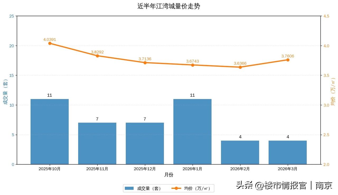 再看价格,从10月的4.04万/㎡,一路小幅震荡下行,2月跌到3.64万/㎡的低点,3月又小幅回升到3.76万/㎡,半年整体跌幅大概7%,属于理性回调,根本没有出现市场传言的恐慌性暴跌。对比2026年南京全市二手房均价,江湾城即便回调后,价格依旧是全市均价的近两倍,就算是市场最冷的时候,也能保持稳定成交,反观南京远郊不少板块,早已陷入有价无市、零成交的困境,这就是核心板块标杆资产的底气。