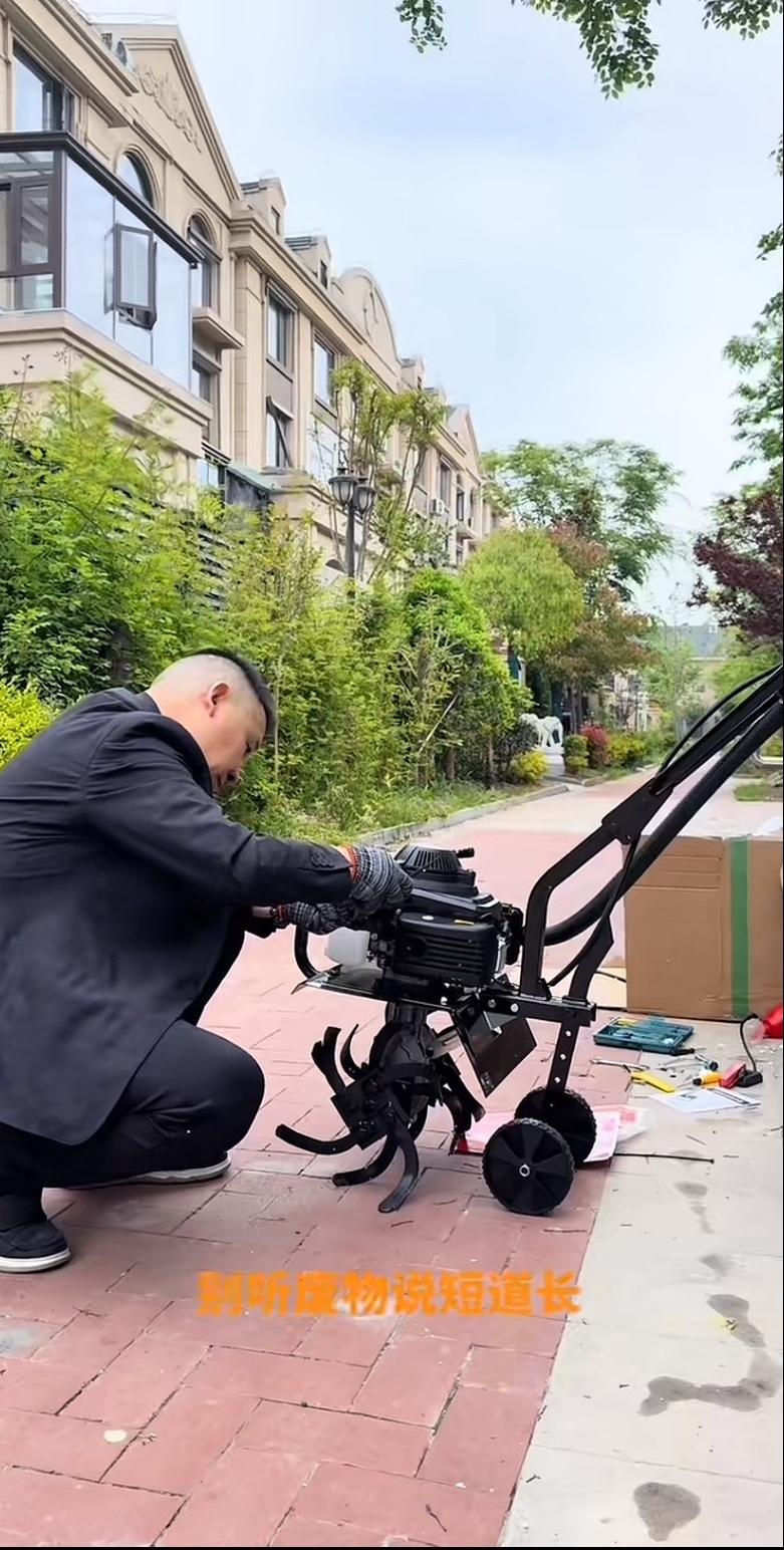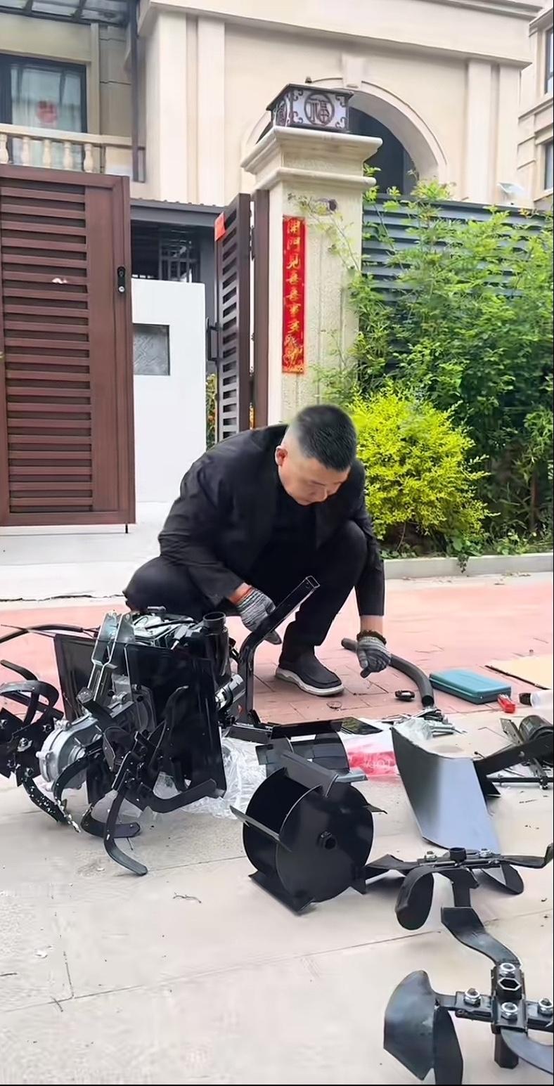 江苏拓瑞集团的徐董事长,天天不琢磨正事。自己别墅门口就那么二三十平米的一小块草坪,想翻一翻重新铺草皮,结果花两千块买了个翻地机,自己动手组装,折腾了半天才装起来。