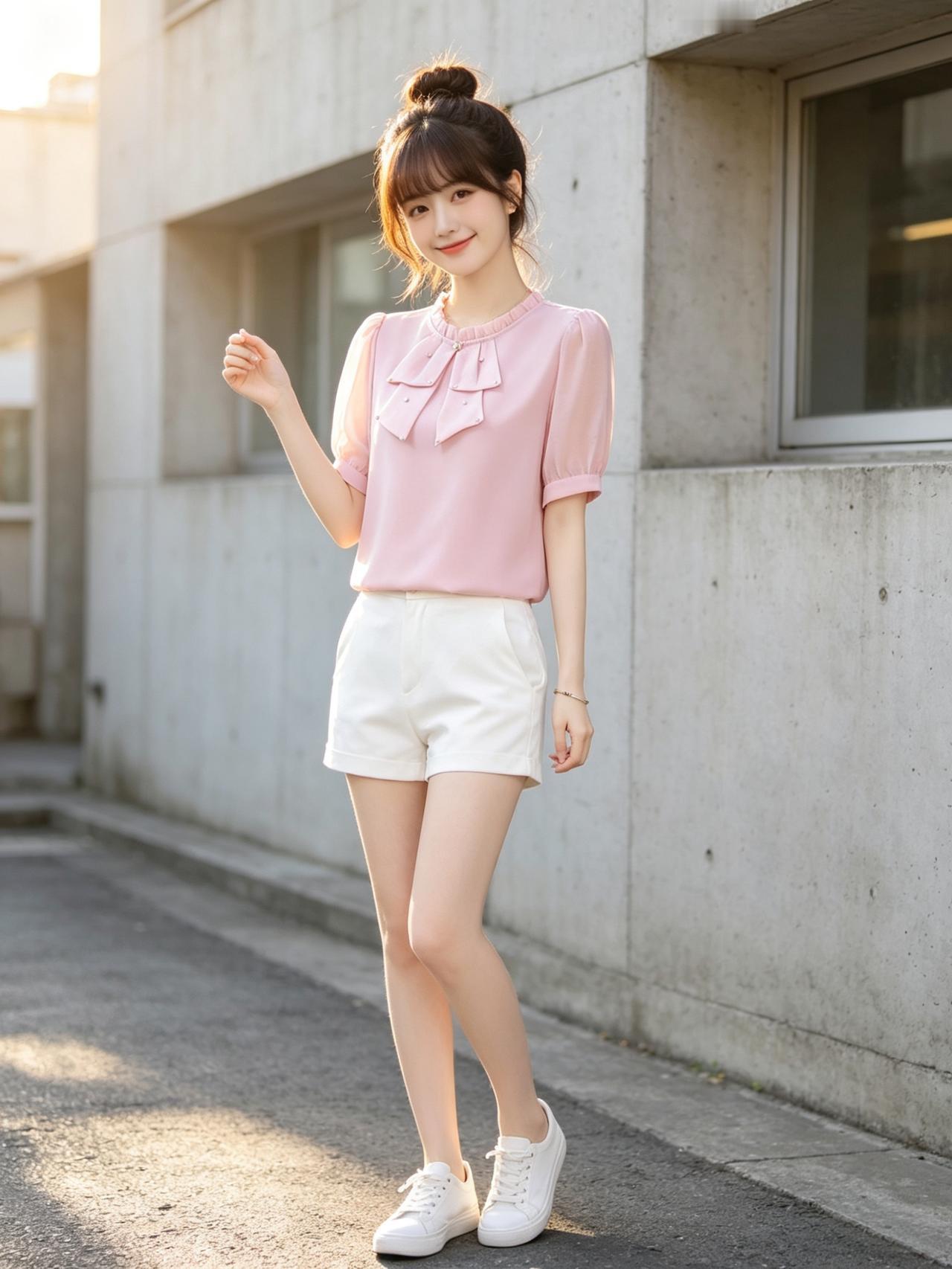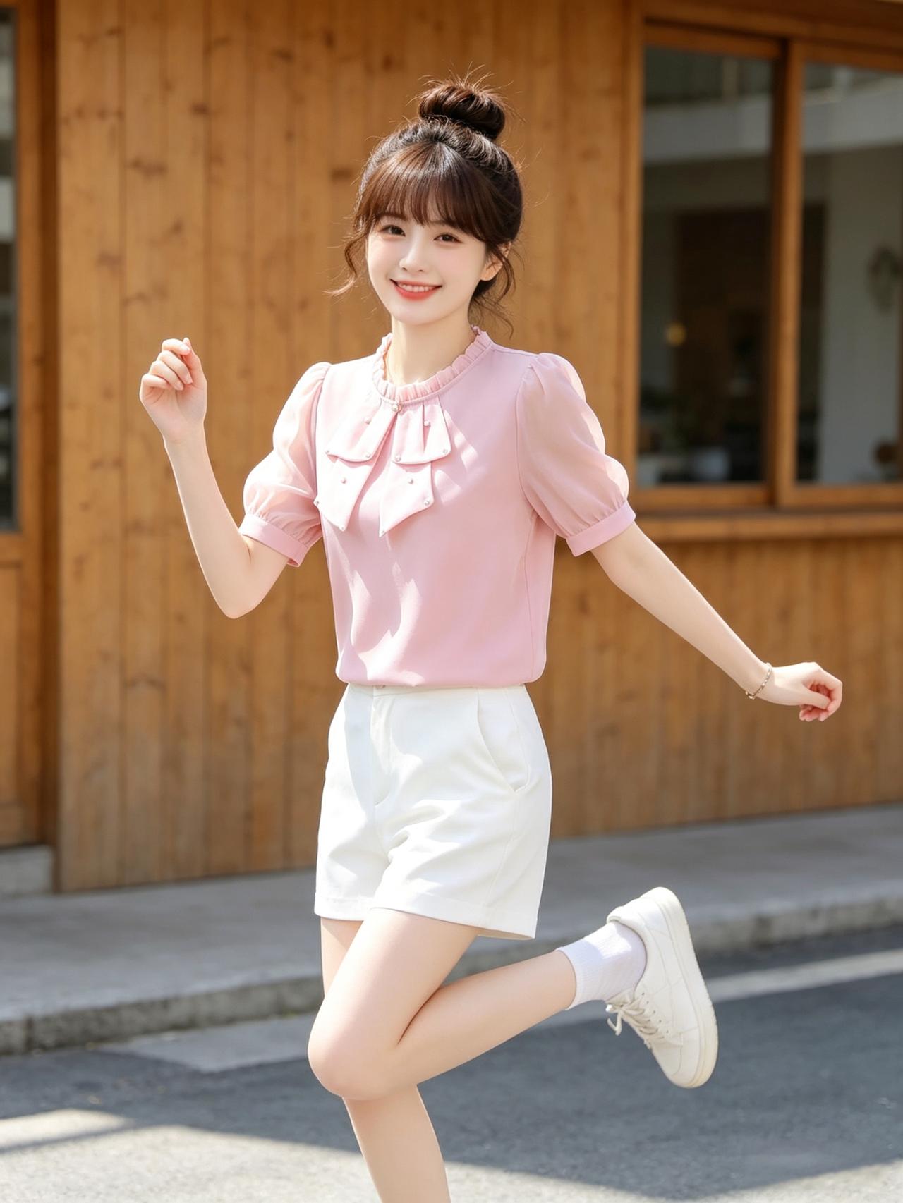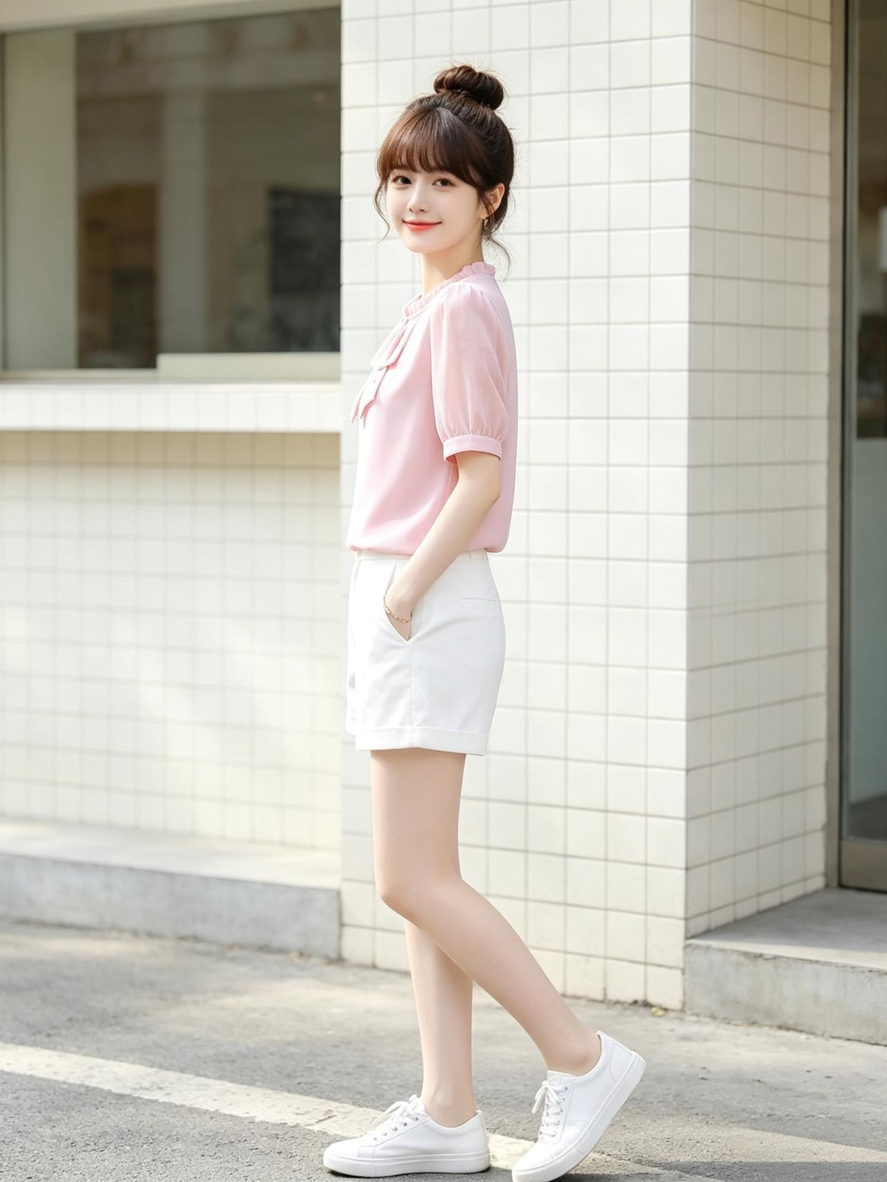 甜美少女风,粉色蝴蝶结上衣搭配白色短裤,元气满满!🌸👗👟优雅自信穿搭分享